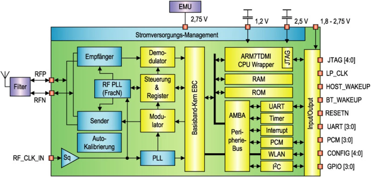Für die Haupt-Standard-Version 1.2 kommen natürlich derzeit auch viele Single-chip-Varianten auf den Markt; so z.B. von STMicroelectronics (www.st.com), die den Single-chip-Bluetooth-Transceiver STLC2500 entwickelten (Bild 6). Der Baustein enthält einen effizient arbeitenden Leistungsverstärker, ein auf einer Ericsson-Q-E!-Plattform aufbauendes Basisband-Teil, einen ARM7-Mikroprozessorkern sowie verschiedene RAM- und ROM-Bereiche.