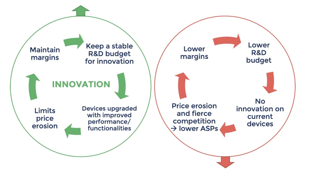 Wenn es der Weltwirtschaft schlecht geht, leiden die Menschen mit dem niedrigsten Einkommen am meisten unter der schwindenden Kaufkraft, was sich wiederum auf die Art und Weise auswirkt, wie sie ihr Einkommen ausgeben. Daher nimmt die Zahl der Smartphones, TWS, Laptops usw. im mittleren und unteren Preissegment tendenziell schneller ab als die der High-End- und Premium-Produkte. Dies ist die erste Dynamik, eine Polarisierung auf der Ebene der Endsysteme.