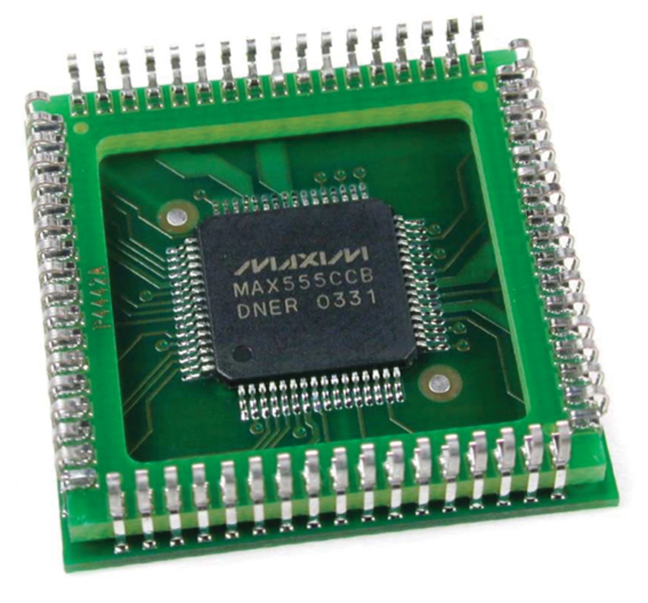 Der MAX555 ist ein monolithischer 12-Bit-D/A-Wandler (DAC) von Maxim Integrated für die Signalrekonstruktion und wurde ursprünglich in einem PLCC-Gehäuse mit 68 Pins gefertigt. Technische Fortschritte machten es erforderlich, den Chip in einem 64-poligen TQFP-Gehäuse mit einem freiliegenden Pad für verbesserte Wärmeableitung zu verpacken. Leider veränderte dieser Gehäusewechsel auch die Ausrichtung des Chips innerhalb des Gehäuses; so ist der Hohlraum nicht mehr unten, sondern oben, was dazu führte, dass sich die Anschlussbelegung veränderte. Der MAX555 steht mittlerweile nur noch in der TQFP-Version zur Verfügung, wodurch Boards, die für das PLCC-Gehäuse entworfen worden sind, nun geändert werden müssten. Alternativ kann man aber auch den neuen MAX555 per Gehäusewandler auf das alte Pinout wandeln.