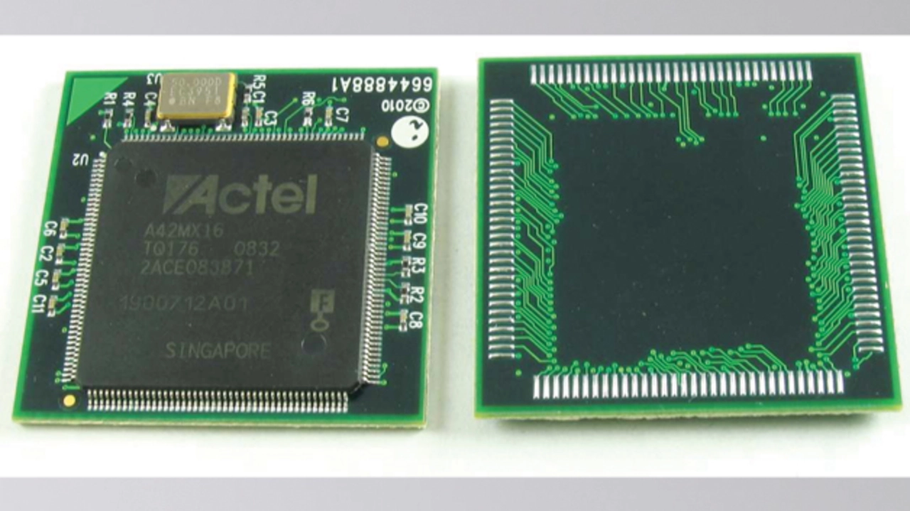 Das schließlich ausgewählte Bauteil, das »A42MX16«, wurde in einem TQFP-Gehäuse mit 176 Pins und dem Rastermaß 0,5 mm gefertigt (Bild 2). Die Unterseite des Gehäusewandlers erhielt die Anschlüsse eines 128-Pin-PQFP, die Oberseite die des TQFP. Zusätzlich wurden auf der Oberseite noch ein SMD-Taktoszillator (5 mm x 7 mm) sowie einige vom Kunden vorgegebene Widerstände und Kondensatoren integriert. Aufgrund der größeren Stellfläche des Adapters von 41 mm x 41 mm kamen passive Komponenten der Größe 0603 zum Einsatz. Anstelle von Gull-Wing-Anschlüssen kam die Lotsäulentechnik (Solder Column) zum Einsatz, damit der Gehäusewandler die auf der Zielplatine geforderte Gesamthöhe nicht überschritt. Die relativ kostengünstige Lotsäulentechnik ähnelt der BGA-Schnittstelle, verwendet jedoch geformtes Lot anstatt runder Lotkügelchen.