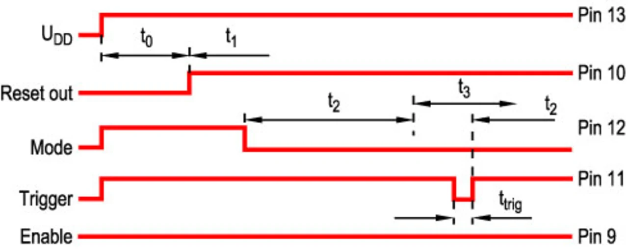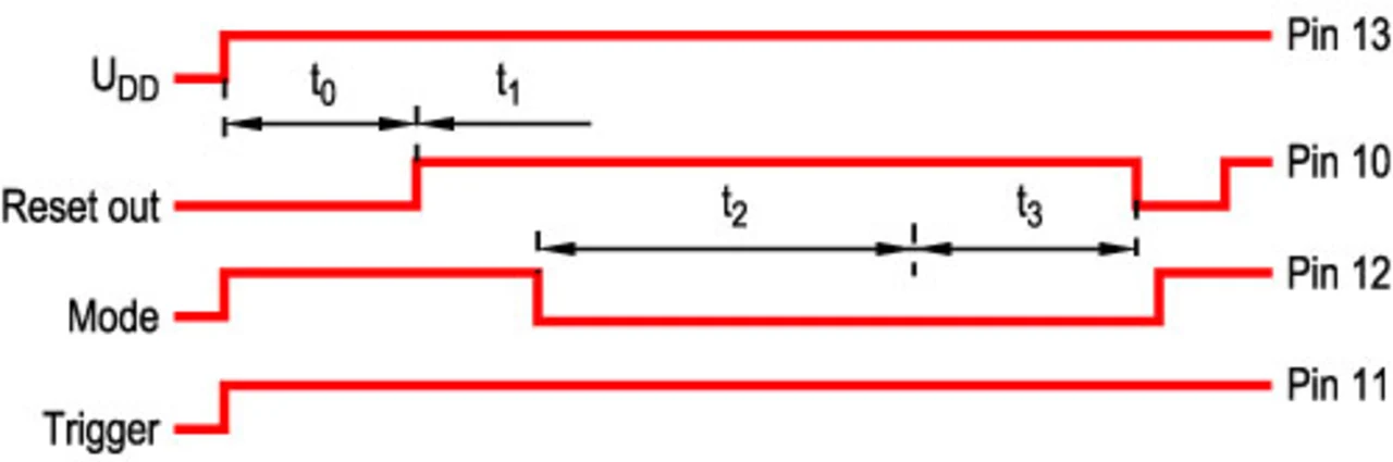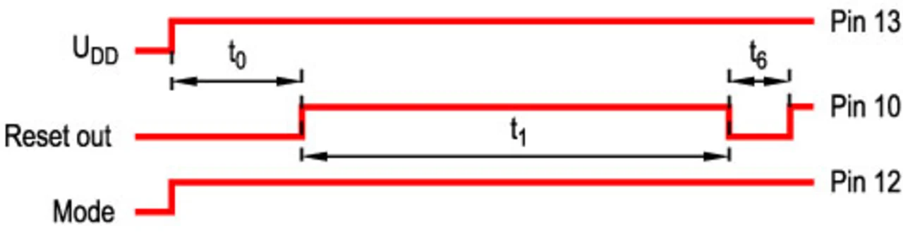 Der Mikrocontroller signalisiert dem Watchdog-Timer einen korrekten Programmstart, indem er auf den Mode-Pin des U5020M innerhalb der Zeit t1 einen Low-Puls legt. Wenn das Low-Signal nicht innerhalb von t1 auftritt, erzeugt der Watchdog einen Reset-Impuls t6, und t1 beginnt erneut (Bild 2).