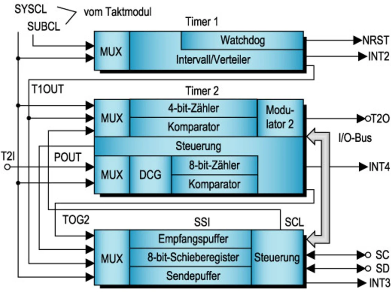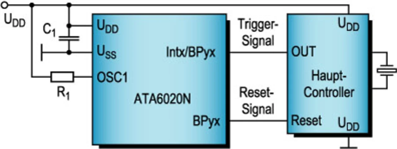 Beide beschriebene Systeme können mit dem ATA6020N realisiert werden. Bild 7 zeigt eine solche einfache Anwendung, bei der der ATA6020N das Trigger-Signal über einen Eingangspin vom Haupt-Controller bekommt. Um die Leistungsaufnahme zu verringern, lässt sich der ATA6020N in den Sleep-Modus schalten, bei dem nur der interne Timer (zur Erzeugung des Reset-Timeout) und die Spannungsüberwachung aktiv bleiben. Der „Reset-Timeout“ kann direkt über die Anwendungssoftware auf die speziellen Anforderungen des Systems eingestellt werden. Diese Zeit erzeugen der Langzeitintervall-Timer (Timer 1), der 8-bit-Timer mit 4-bit-Vorteiler (Timer 2) oder beide zusammen in einer kombinierten Betriebsart (Bild 8). Somit lassen sich Zeiten von wenigen Mikrosekunden bis zu mehreren Sekunden nahezu beliebig einstellen.