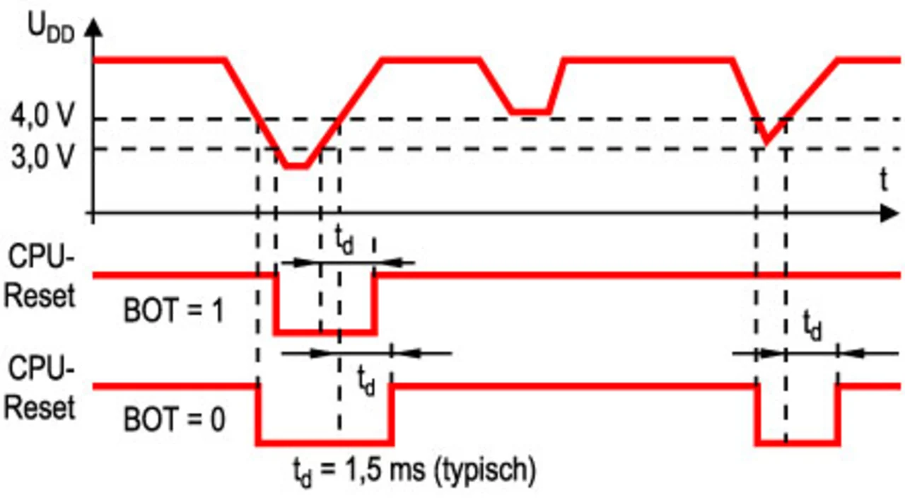 Neben der Überwachung des Triggersignals überwachen Watchdog-Timer auch die Versorgungsspannung des Mikrocontrollers. Unterschreitet die Spannung die untere Schwelle, wird der Mikrocontroller in den Reset-Zustand versetzt und so lange dort gehalten, bis die Spannung wieder einen ausreichenden Pegel erreicht hat.