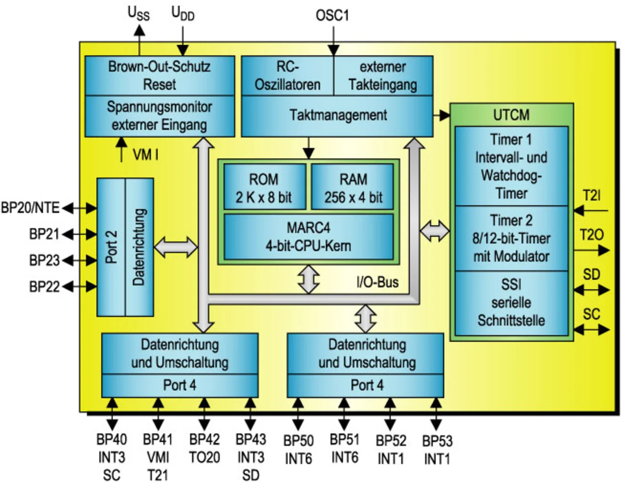 Der Baustein ATA6020N (Bild 5) ist Teil der 4-bit-Mikrocontroller-Familie MARC4 von Atmel und verfügt über einen vom Anwender programmierbaren ROM-Speicher von 2 Kbyte. Dieser Programmspeicher wird bei der Herstellung mit dem Anwenderprogramm des Kunden maskenprogrammiert. Der statische RAM-Speicherbereich ist 256 x 4 bit groß; er dient zur Speicherung von Variablen und Feldern und enthält zwei Stack-Speicherbereiche. Darüber hinaus umfasst der Baustein einen 8-bit-Multifunktions-Timer mit Modulatorfunktion, 12 bidirektionale Ein-/Ausgabe-Leitungen, eine Spannungsüberwachung, einen Langzeit-Intervall-Timer mit Watchdog-Funktion und eine eigene Takterzeugung auf dem Chip mit externem Takteingang und integrierten RC-Oszillatoren.