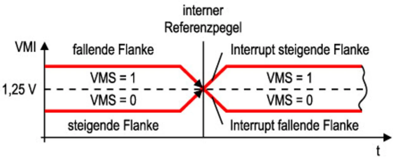 Die zweite Betriebsart der Spannungsüberwachung stützt sich auf ei-ne interne stabilisierte Spannung von 1,25 V für den Komparator und vergleicht den Anschluss VMI/BP41 bezüglich dieser Spannung (Bild 10). Diese Betriebsart gibt dem Schaltungsentwickler die Flexibilität, beliebige Spannungspegel erkennen zu können. Durch eine geeignete Software hat der Systementwickler die Möglichkeit, individuell auf Spannungsabfälle reagieren zu können.