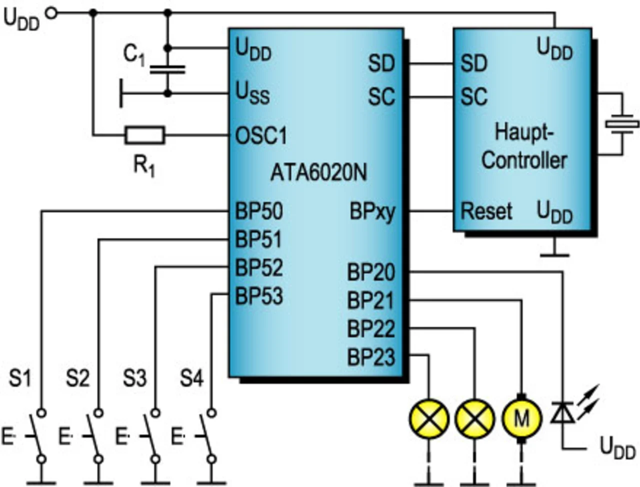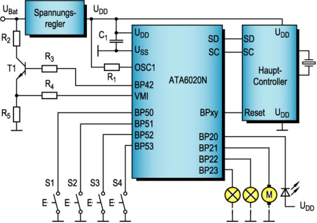 Nachdem der Haupt-Controller seine letzte Aufgabe beendet hat, wird er ausgeschaltet, um die Leistungsaufnahme zu verringern. Der ATA6020N selbst wird in den Power-Down-Modus geschaltet (die CPU befindet sich im Sleep-Modus, während Oszillator und Timer aktiv bleiben). In dieser Betriebsart beträgt die Stromaufnahme des ATA6020N typischerweise 30 µA mit UDD = 5,0 V. Wenn eine der Tasten S1 bis S4 gedrückt wird, empfängt der ATA6020N ein Interrupt-Signal, und der Prozessorkern verlässt sofort den Sleep-Modus. Nach der Entprellung der Taste aktiviert der ATA6020N den Haupt-Controller, der dann über eine Zweidrahtschnittstelle (TWI) die Daten vom ATA6020N einliest und im Normalbetrieb fort fährt.