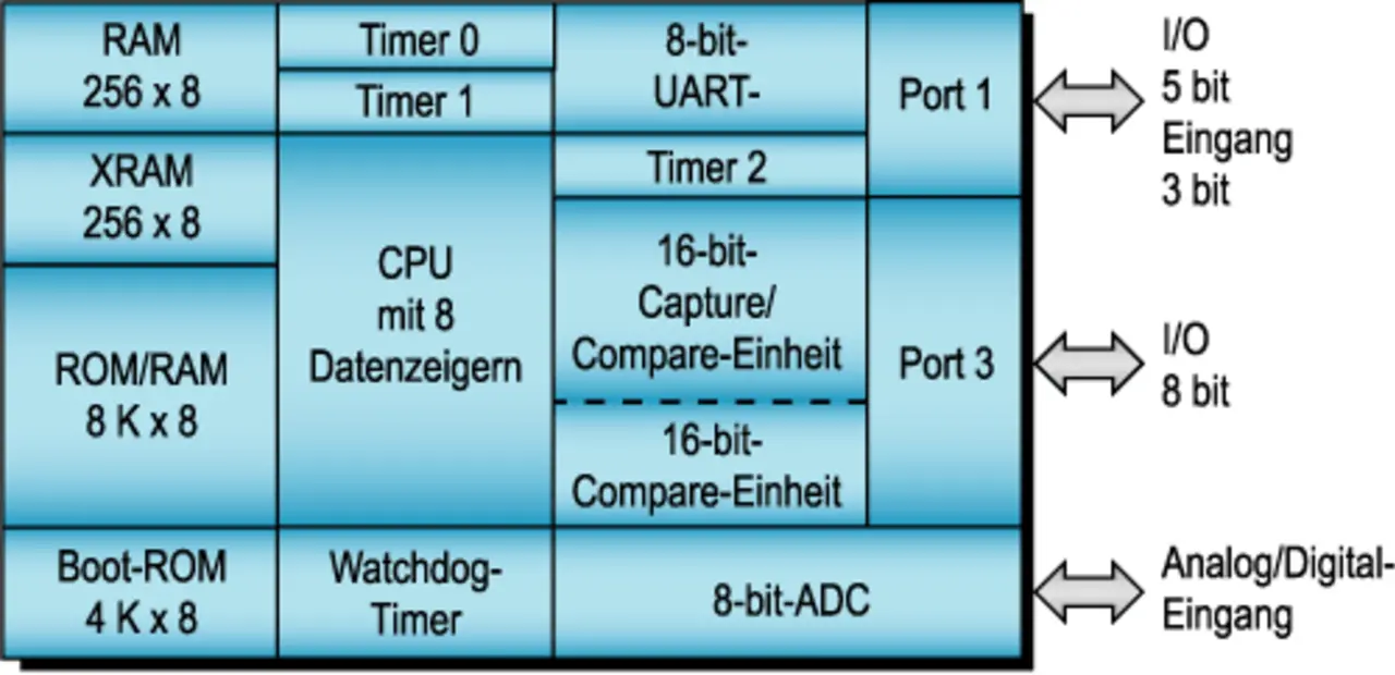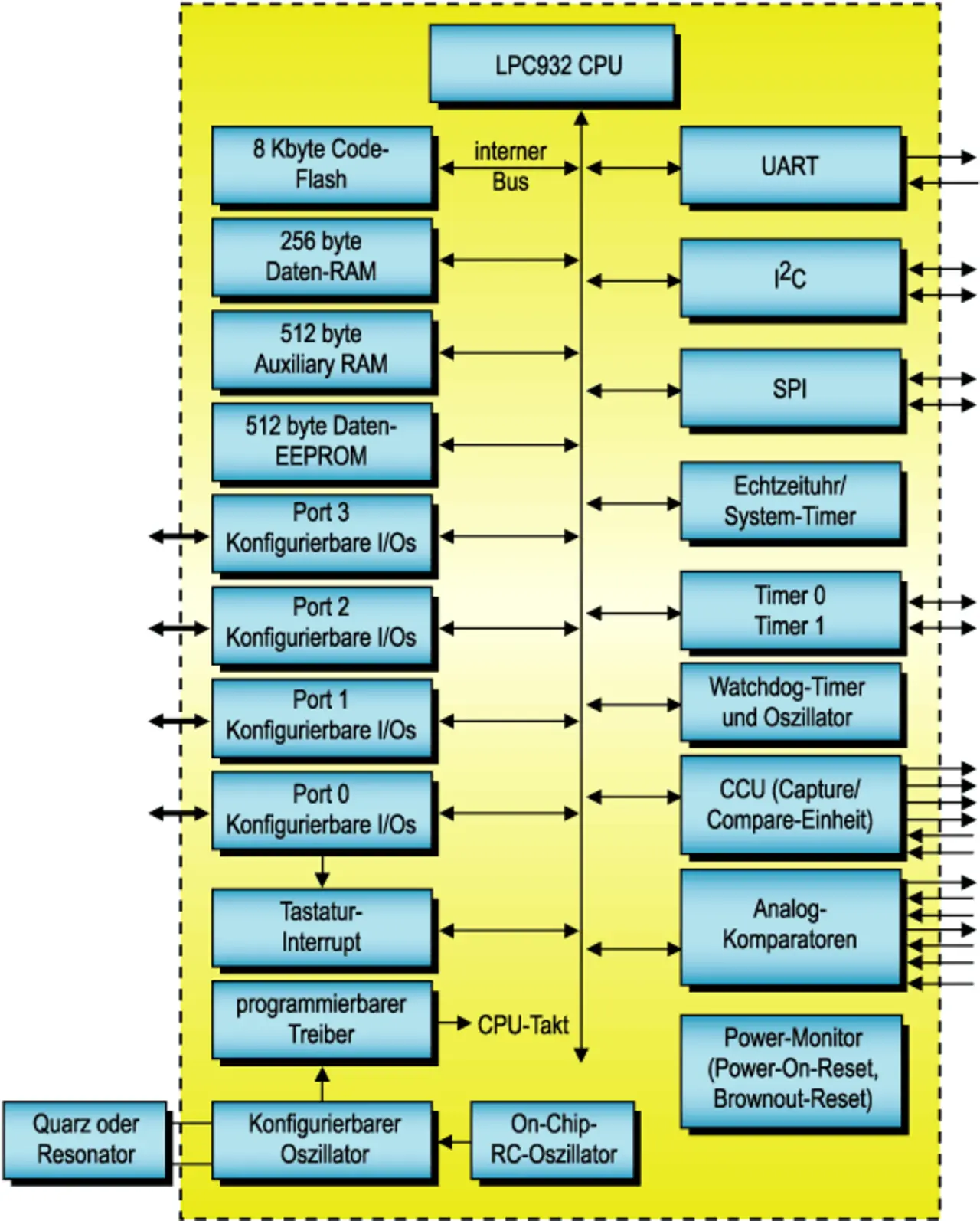 Der erste Europäer in der Rangliste ist Philips Semiconductors auf Platz 8. Die Holländer setzen auf die weit verbreitete 8051-Architektur, die sie um neue Mikrocontrollerfamilien mit gesteigerter Rechenleistung erweitert haben. Im Gegensatz zu den klassischen 8051ern führt der verbesserte Rechenkern die meisten Befehle in zwei bis vier Taktzyklen aus, das entspricht der sechsfachen Geschwindigkeit. Typischerweise arbeitet der schnelle 8051-Kern mit Taktfrequenzen von 12 MHz und Befehlszykluszeiten zwischen 167 und 333 ns, mit Ausnahme der Multiplikationen und Divisionen. Der Baustein P89LPC932 auf Basis des verbesserten Kerns zeigt exemplarisch den Stand der Technik (Bild 3): Der Mikrocontroller verfügt über 8 Kbyte Flash-Speicher, 512 byte Daten-EEPROM, 256 byte Daten-RAM sowie 512 byte Auxiliary RAM. Die Peripherie umfasst eine Vielzahl von Schnittstellen (UART, I2C, SPI, vier Ports mit konfigurierbaren I/Os), eine Capture/Compare-Einheit, Analogkomparatoren sowie eine eigene Takterzeugung und verschiedene Timer (Echtzeituhr, Timer, Watchdog).