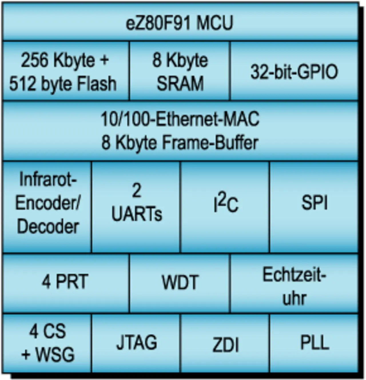 Die mit 50 MHz getaktete 8-bit-CPU eZ80 läuft im Z80-kompatiblen Modus mit einem Adressraum von 64 Kbyte oder im erweiterten Adressierungsmodus, der bis zu 16 Mbyte ansprechen kann. Zwei Registerbänke ermöglichen schnelle Kontext-Umschaltungen. Für Programme stehen 256 Kbyte und für Konfigurationsdaten 512 byte Flash-Speicher zur Verfügung. Der Datenspeicher umfasst 8 Kbyte. Die umfangreichen Schnittstellen verraten das Anwendungsgebiet: die Vernetzung. Eine echte Besonderheit ist der integrierte Ethernet Media Access Controller für 10/100-BaseT mit eigenem, 8 Kbyte großem Frame-Buffer. Doch darüber hinaus gibt es auch zwei UARTs, einen IrDA-Encoder/Decoder sowie eine I2C-Schnittstelle und eine SPI. Der relativ komplexe Baustein sitzt in einem 144-Pin-LQFP, arbeitet mit einer Betriebsspannung von 3,0 bis 3,6 V und besitzt 5-V-tolerante Eingänge.