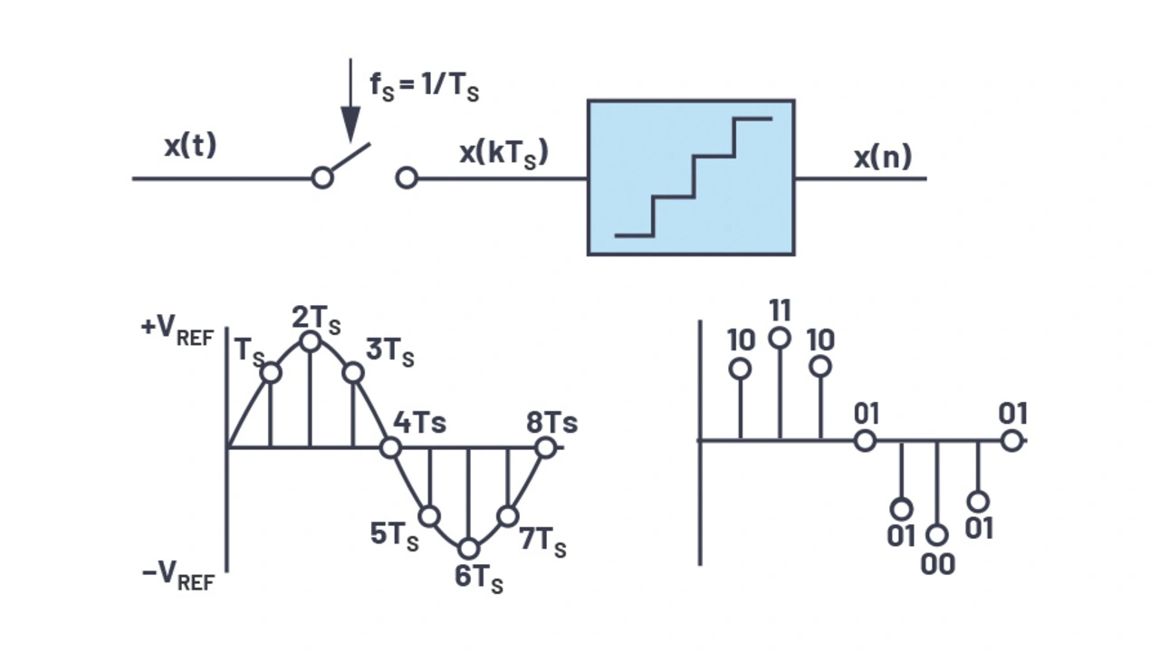 Der zweite Schritt ist die Quantisierung, bei der Wert der zuvor erfassten zeitdiskreten Signalproben an einen der endlich vielen möglichen Werte angenähert und als digitaler Code ausgegeben wird, wie in Bild 1 gezeigt. Da diese Quantisierung wie erwähnt auf endlich viele Werte erfolgt, entsteht bei der Digitalisierung unweigerlich ein Fehler, der als Quantisierungsrauschen bezeichnet wird.