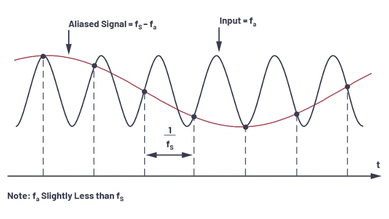 In diesem Beispiel beträgt die Abtastfrequenz fS nicht annähernd das Doppelte der analogen Eingangsfrequenz fa, sondern ist nur geringfügig höher als diese. Das Nyquist-Kriterium ist somit nicht erfüllt. Wie in Bild 2 zu sehen, entsteht durch Aliasing-Effekte eine zusätzliche Sinusschwingung mit der Frequenz fS – fa.