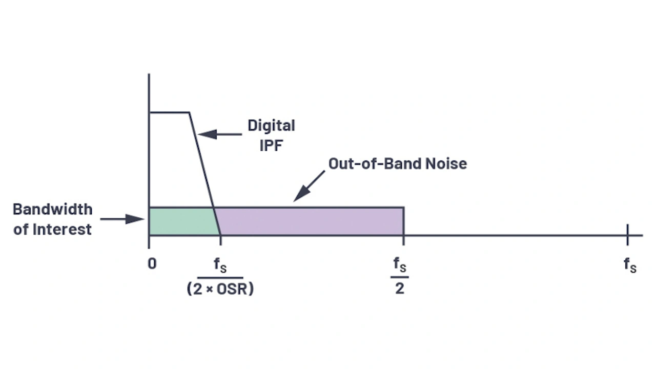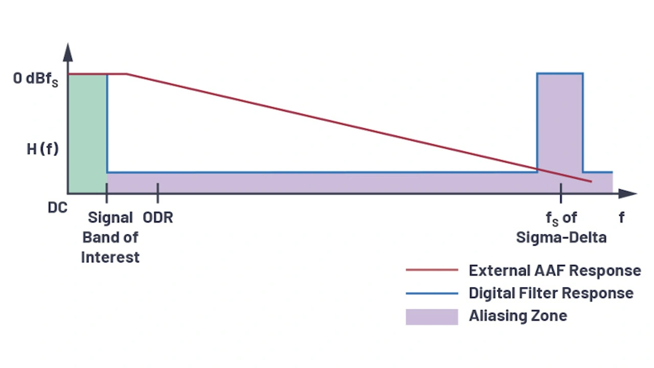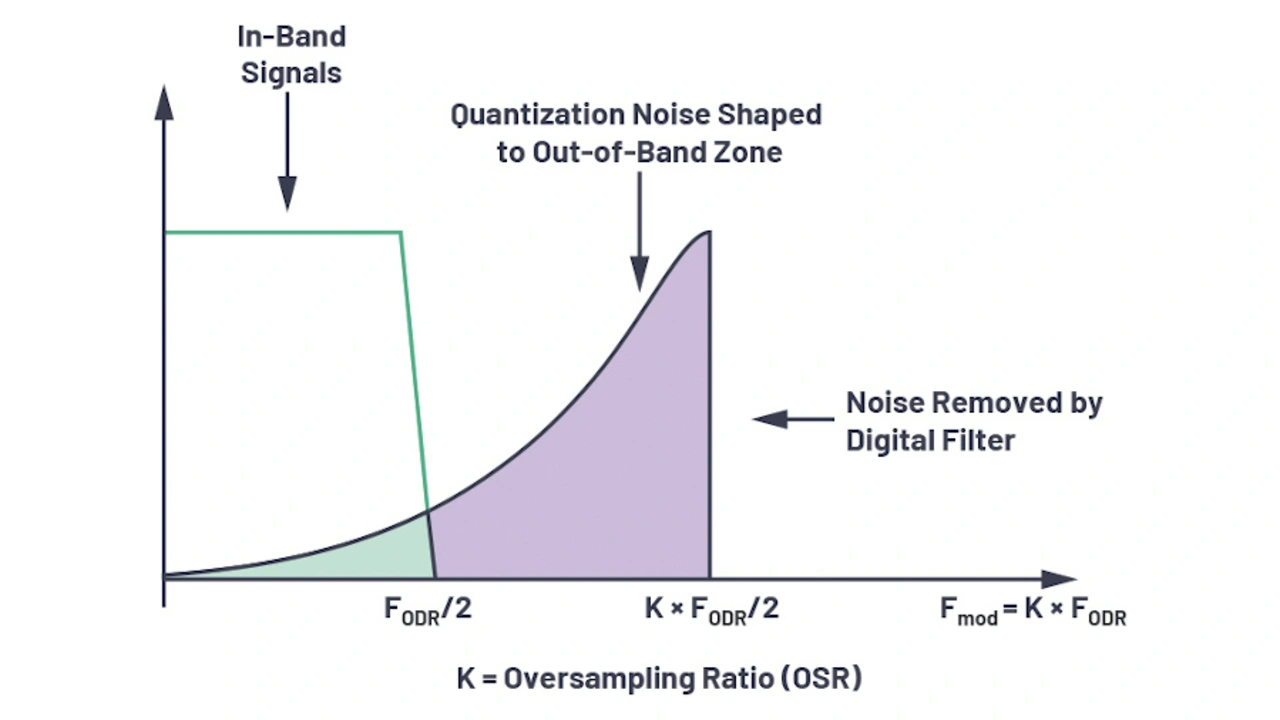 Der Sigma-Delta-ADU erzielt innerhalb des Nutzbandes (In-Band) eine hohe Auflösung, indem er das Noise Shaping mit dem Oversampling kombiniert. Die Nutzbandbreite beträgt fODR/2, wobei ODR für die Ausgangs-Datenrate (Output Data Rate) steht. Um die Auflösung zu erhöhen, kann die Ordnung des Schleifenfilters oder das Oversampling-Verhältnis (OSR) angehoben werden.