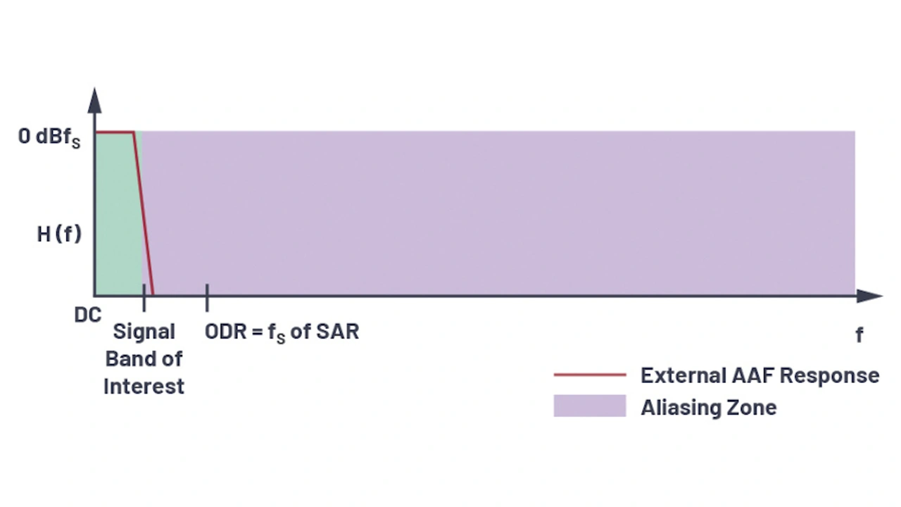 Wird eine 3-dB-Eingangsbandbreite von 100 kHz gewählt, um bei der Abtastfrequenz fS eine Dämpfung von 102 dB zu erzielen, reicht für einen DTSD-ADU ein Anti-Aliasing-Filter zweiter Ordnung aus. Dagegen wird bei einem SAR-ADU ein Filter fünfter Ordnung benötigt, um bei fS dieselbe Dämpfung zu erreichen.