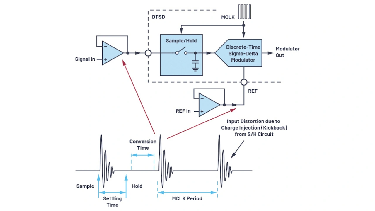 In Bild 10 ist das Kickback-Phänomen an einem DTSD-ADU dargestellt. Beträgt die Abtastfrequenz beispielsweise 24 MHz, muss sich das Datensignal binnen 41 ns stabilisieren. Da die Referenz ebenfalls ein Schalter-Kondensator-Eingang ist, wird auch am Referenzeingang ein breitbandiger Verstärker (Puffer) benötigt. Diese Verstärker für das Eingangssignal und das Referenzsignal erhöhen das Rauschen und beeinträchtigen die allgemeine Leistungsfähigkeit der gesamten Signalverarbeitung. Abgesehen davon führen die Verzerrungskomponenten aus dem eingangsseitigen Verstärker in der Umgebung der Abtast- und Haltefrequenz dazu, dass sich die Anti-Aliasing-Anforderungen erhöhen. Hinzu kommt schließlich auch, dass bei Schalter-Kondensator-Eingängen etwaige Änderungen der Abtastrate zu einem variierenden Eingangsstrom führen. Dies kann ein erneutes Abstimmen des Systems erforderlich machen, um den im Eingangsverstärker oder in der vorangehenden Stufe beim Ansteuern des ADUs entstehenden Verstärkungsfehler zu verringern.