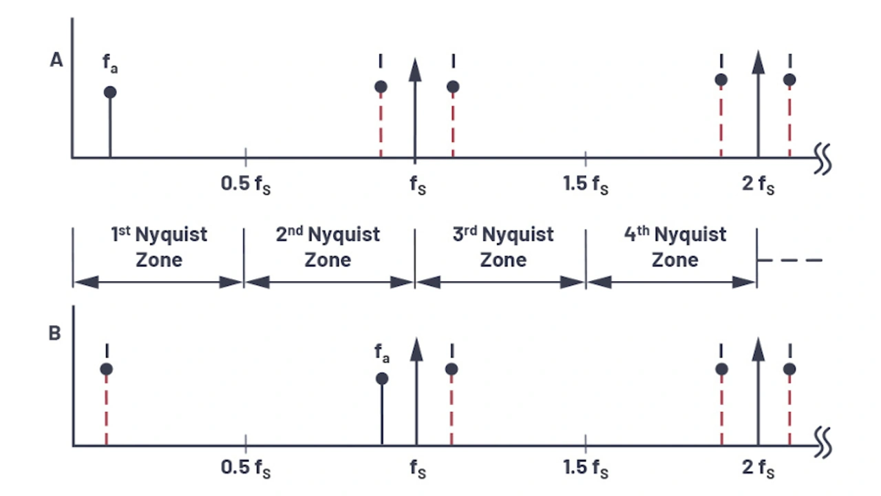 In Bild 3 ist dasselbe Szenario im Frequenzbereich wiedergegeben. Der Frequenzbereich von DC bis fS/2 wird als Nyquist-Bandbreite bzw. erste Nyquist-Zone bezeichnet. Das Frequenzspektrum teilt sich in eine unendliche große Zahl von Nyquist-Zonen auf, die alle eine Breite von fS/2 haben. In der Praxis wird das ideale Abtastglied durch einen ADU mit einem anschließenden FFT-Prozessor (Fast Fourier Transform) ersetzt. Letzterer erzeugt nur einen Ausgang von DC bis fS/2, also jene Signale oder Aliasing-Produkte, die in der ersten Nyquist-Zone auftreten.