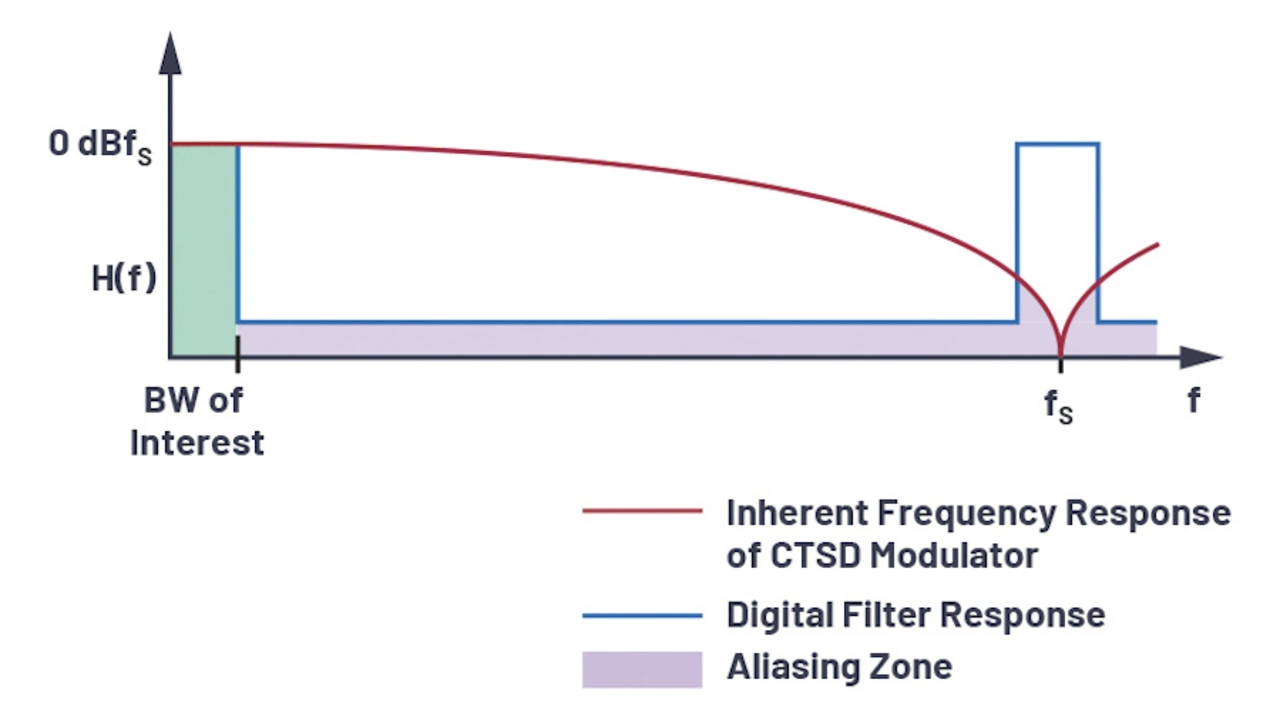 Die inhärente Aliasing-Unterdrückung ermöglicht den Verzicht auf ein separates Anti-Aliasing-Filter, was den Bedarf an Bauelementen reduziert und kleinere Baugruppenabmessungen ermöglicht. Wichtiger noch ist, dass alle Probleme vermieden werden, die sich mit einem Anti-Aliasing-Filter einstellen – z.B. Droop, Offset-, Verstärkungs- und Phasenfehler sowie Rauschen.