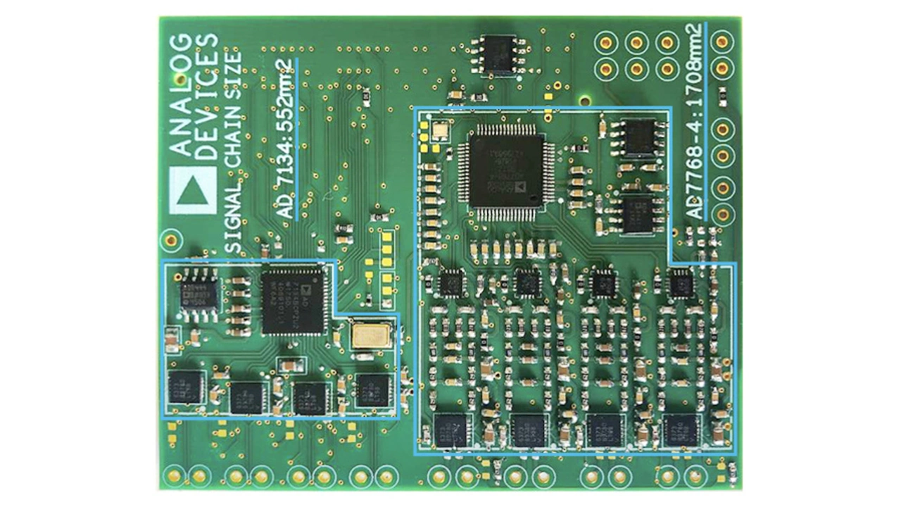 In Bild 14 ist ein Vergleich zwischen einer zeitdiskreten ADU-Schaltung und einer zeitkontinuierlichen ADU-Schaltung zu sehen. Im Vergleich ergibt sich eine Flächenersparnis von 70 %, sodass die zeitkontinuierliche Schaltung die ideale Wahl für mehrkanalige Anwendungen mit hoher Dichte ist. Die zugehörige Leiterplatte ist in Bild 15 zu sehen.