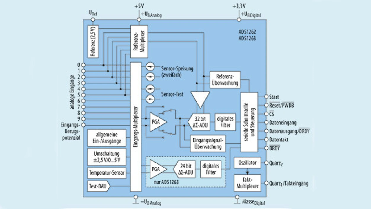 Die ADUs ADS1262/3 (Bild 3) sind mit analogen und digitalen Überwachungsverfahren ausgestattet, die ihre Diagnosefähigkeit um eine zusätzliche Ebene erweitert. Im Analogteil erkennt der integrierte programmierbare Verstärker (PGA – Programmable Gain Amplifier) Bereichsüberschreitungen und detektiert die Versorgungsspannung. Die erstgenannte Funktion stellt fest, ob die differenzielle Ausgangsspannung des programmierbaren Verstärkers mehr als 105 % des Bereichs für Vollaussteuerung (UREF) beträgt. Die zweite Funktion dagegen setzt ein Flag-Bit, wenn die Spannung an einem der beiden Verstärkerausgänge bis auf weniger als 100 mV an die positive oder negative Versorgungsspannung (+UB Analog oder -UB Analog) heranreicht. Beide ADUs enthalten außerdem eine Funktion zur Erkennung von Referenzfehlern. Hierzu wird die differenzielle Referenzspannung (+UREF – –UREF) kontinuierlich mit 0,4 V verglichen. Die ADUs aktualisieren das Status-Byte in jedem Digitalisierungszyklus und zeigen damit an, ob die Referenzspannung unter diesen Grenzwert gesunken ist.
