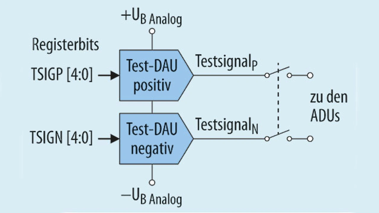 Die Signale des Test-ADU lassen sich außerdem aus dem Baustein herausführen, um die Signalaufbereitungsschaltung zu analysieren.
