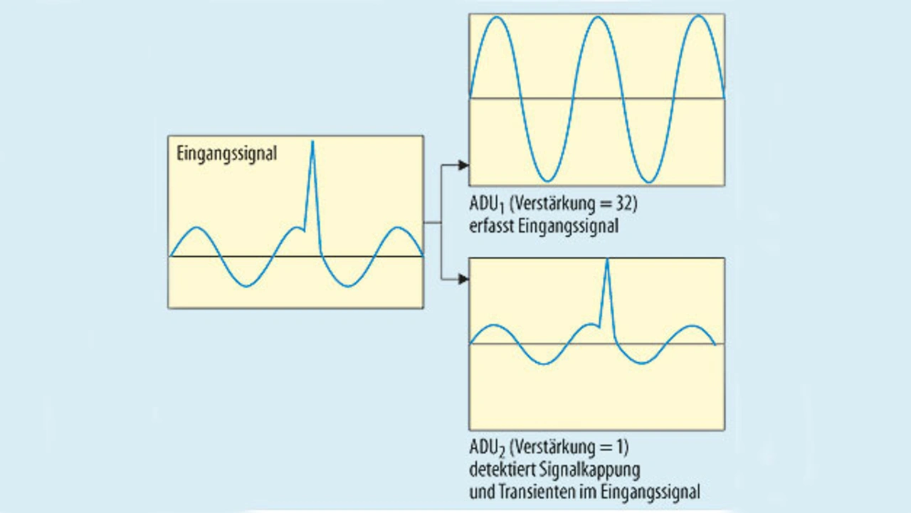 Ergänzend zur bereits beschriebenen redundanten Messmethode lässt sich der zusätzliche ADU auch nutzen, um redundante Messungen des Haupt-ADU mit einer abweichenden Verstärkung durchzuführen. Diese Konfiguration gibt dem Anwender die Möglichkeit, ein kleines Signal, beispielsweise von einer Messbrücke, aus anderer Perspektive zu betrachten. Ferner ermöglicht dies, Anomalien zu detektieren, z.B. von gekappten Signalen oder Transienten, die sonst möglicherweise unentdeckt bleiben und als gültige Daten weitergeleitet würden. Für dieses Verfahren wird der Haupt-ADU mit einer hohen Verstärkung von beispielsweise 32 konfiguriert, wogegen der zusätzliche ADU mit einer Verstärkung von 1 arbeitet (Bild 6).