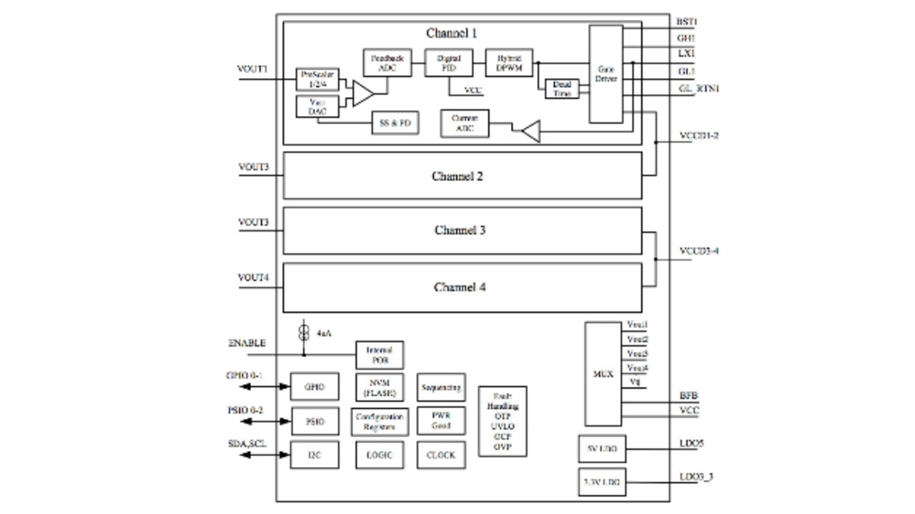 Betrachten wir Designs mit FPGAs, DSPs, Applikationsprozessoren, Media-Prozessoren oder Mikrocontrollern. Diese benötigen normalerweise verschiedene Spannungsschienen: 5 V für die analogen Schaltungsteile, 3,3 V für die digitalen, 1,5 V bis 2,5 V für den Speicher und eine für den Prozessor-Core beziehungsweise die Cores. Um diese getrennten Spannungen mit analogen Reglern bereitzustellen, sind zahlreiche Bauteile erforderlich, die viel Platz auf der Leiterplatte einnehmen. Dies erhöht die Komplexität und schränkt den Fortschritt des Systemdesigns ein.