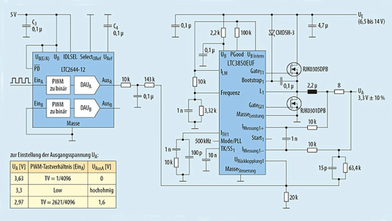 Bild 3 zeigt eine typische Anwendung für einen PWM-zu-Analog-Umsetzer (LTC2644-12) in einem DC/DC-Wandler zum Einstellen der Ausgangsspannung. Mit dem auf High-Pegel fixierten IDLSEL-Anschluss des LTC2644 wird der IC auf den Abtast-Halte-Betrieb festgelegt. Beim Einschalten sind die Ausgänge der beiden DAUs hochohmig – die Ausgangsspannung des DC/DC-Wandlers wird nicht beeinflusst. Ein kontinuierlicher Low-Pegel am Eingang des PWM-zu-Analog-Umsetzers versetzt den Ausgang ebenfalls in einen hochohmigen Zustand, ein High-Pegel dagegen hält den Ausgang auf dem zuvor ausgegebenen Spannungswert. Somit kann die Ausgangsspannung des DC/DC-Wandlers während des Einschaltvorganges einmalig mit einem PWM-Burst und folgendem High-Pegel auf den gewünschten Wert eingestellt werden.