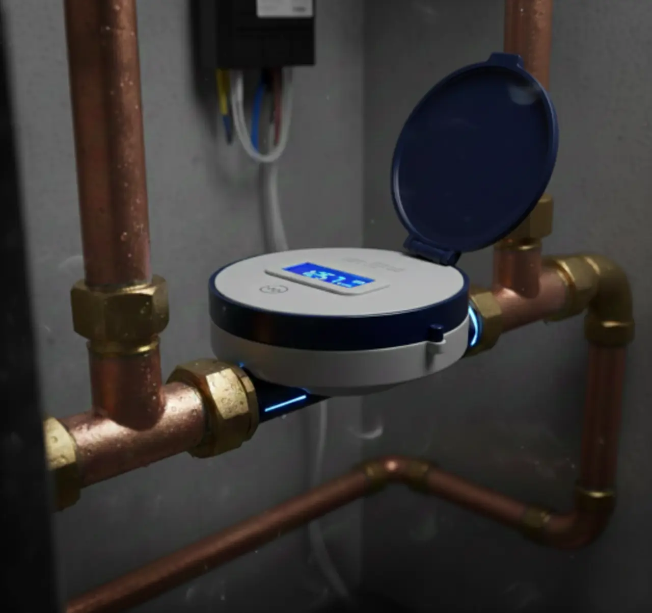 Intelligenter Ultraschall-Wasserzähler in einer Wohngebäudeinstallation. In dem Zähler arbeitet ein ASIC von Cyient Semiconductors, das eine präzise bidirektionale Durchflussmessung sowie einen wartungsfreien Langzeitbetrieb in geschlossenen Systemen ermöglicht.