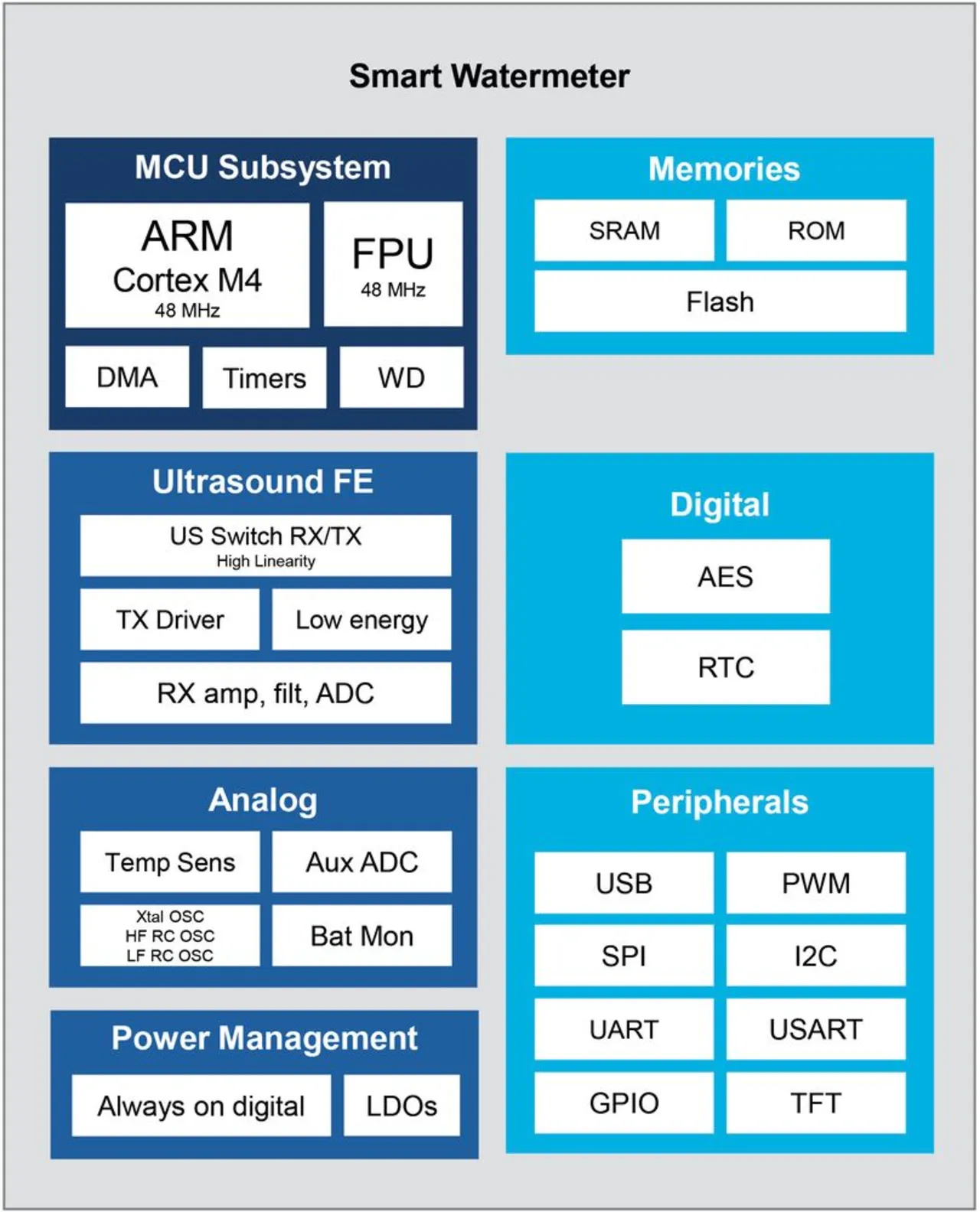 System-Blockschaltbild einer Smart-Water-Meter-Architektur von Cyient Semiconductors. Dargestellt ist die Integration von Ultraschallsensorik, Analog-Front-End, MCU-Subsystem, Speicher, Power-Management und Kommunikationsschnittstellen in einem einzigen ASIC.
