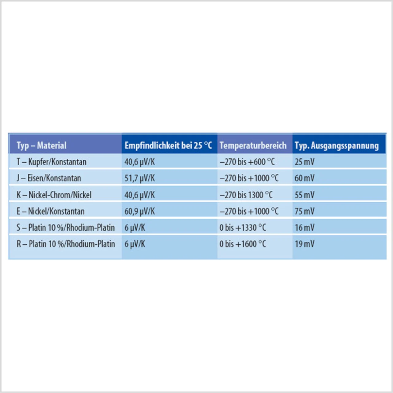 Durch die direkte Mikrocontroller-Anbindung des digitalen Potentiometer via I²C ist die Anpassung der Thermoelemente sehr einfach. Für die Messung der Kaltstelle oder Klemmentemperatur gibt es viele Temperatursensoren. Gängige Typen sind Pt100, PTC- oder NTC-Widerstände, Halbleitersensoren oder eine einfache Siliziumdiode. Die wichtigsten Vorgaben bei dieser Schaltungsentwicklung waren die Universalität der Schaltung und eine hohe Genauigkeit der Kaltstellenmessung. Mit der gezeigten Schaltung lassen sich sowohl massebezogene Thermoelemente als auch Floating-Thermoelemente differentiell anschließen. Die beiden Widerstände R4 und R5 (Bild 4) bilden den Spannungsteiler zum Abgleich des Seebeck-Koeffizienten. Beim Abgleich der Kompensationsspannung bzw. bei der Wahl der Widerstände muss darauf geachtet werden, dass die Tabelle 1 nur eine Empfehlung ist. Die Thermoelemente haben keinen konstanten Seebeck-Koeffizienten über den gesamten Temperaturbereich. Ein Thermoelement vom Typ R – das aber in der Praxis nicht so oft verwendet wird – hat z.B. bei 0 °C einen Koeffizienten von 5,3 μV/K, bei 1000 °C hingegen liegt er bei 13,2 μV/K. Deshalb muss der Anwender mit Hilfe eines Tabellenbuchs den jeweiligen Seebeck-Koeffizienten des Temperaturbereichs auswählen. Die Empfehlungen unter Berücksichtigung des Spannungsteilers R4 und R5 und Register-Inhalt (Av = 1 und N Register = 0) findet man in Tabelle 2.