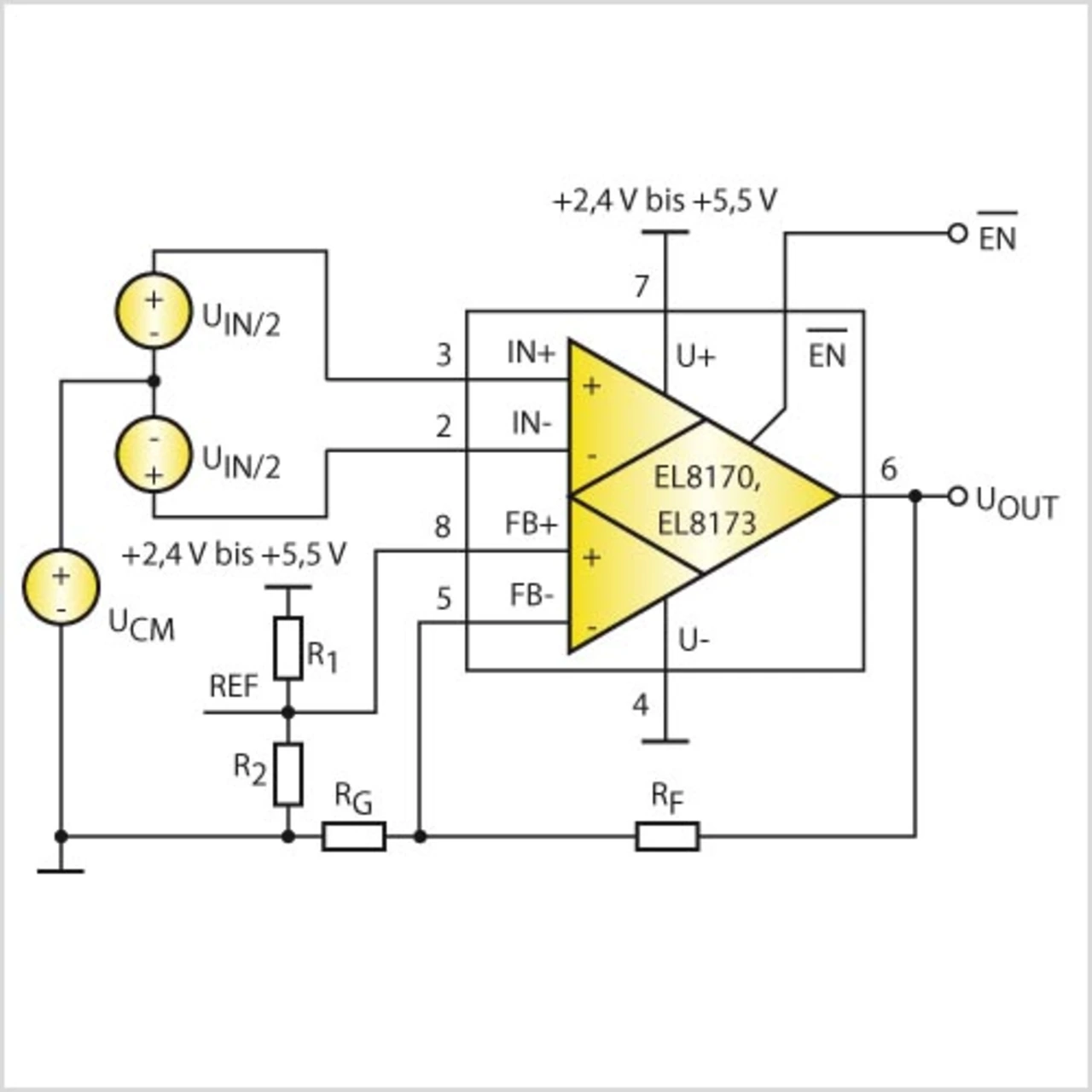 Der Widerstand R3 sorgt für einen definierten Bezugspunkt an den Instrumentenverstärkereingängen und verhindert eine Übersteuerung des Instrumentenverstärkers EL8173 bei offenen Eingangsklemmen. Bei der Topologie der Schaltung wurde gezielt darauf geachtet, einen „echten“ Differenzverstärker einzusetzen. Somit lässt sich sowohl ein so genanntes Floating-Thermoelement ohne Massebezug, wie in der Praxis meist üblich, als auch ein massebezogenes Thermoelement anschließen.