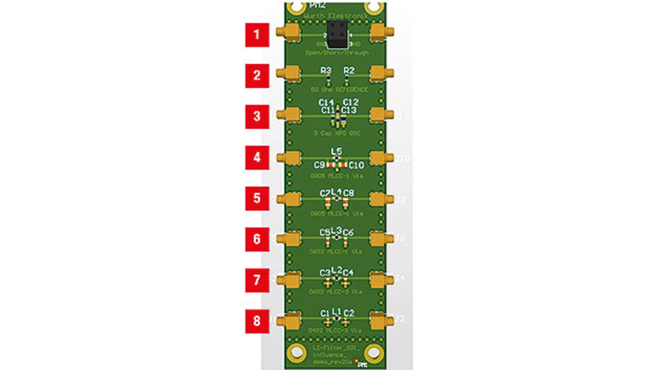 Um die verschiedenen Einflüsse in der Praxis zu zeigen, erstellte ein Expertenteam bei Würth eine vierlagige Platine, die auf eine Impedanz von genau 50 Ω ausgelegt ist und mit der sich die Einfügedämpfung S21 über den Frequenzbereich von 300 kHz bis 3 GHz ermittelten lässt. Ergänzend kam eine Simulationssoftware zum Einsatz, um zu ermitteln, wie nahe man an die reale Messung mittels eines Netzwerkanalysators anknüpfen kann und wie stark die Positionierung von Vias (Durchkontaktierungen auf der Leiterplatte) relativ zueinander die Parameter beeinflusst. Als HF-Steckverbinder wurden die MMCX-Typen der Würth Elektronik eiCan ausgewählt.