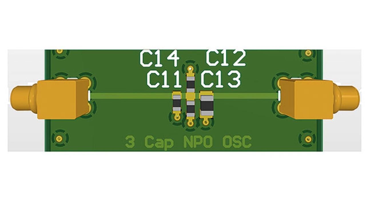 Zusätzlich ist noch ein Messkanal implementiert, um zu untersuchen, wie es sich auswirkt, wenn mehrere MLCCs aus Klasse-1-Keramik (NP0/C0G) mit unterschiedlichen Kapazitäten (100 pF, 1 nF und 4,7 nF) parallel geschaltet sind. Da die Kondensatoren, bei denen das Dielektrikum aus Titanoxid besteht, ein besonders hohe Güte haben, stehen ungünstige Resonanzen zwischen den verschiedenen kapazitiven und induktiven Elementen zu befürchten.