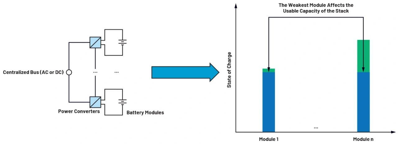 Eine typische Implementierung besteht aus verschiedenen Stapeln von Batteriemodulen, die ihre Energie über Leistungswandler an die zentralen Wechsel- oder Gleichstrombusse übertragen (um die Energie anschließend in irgendeiner Form an die Verbraucher zu verteilen). Die Herausforderung bei dieser Art von System liegt darin, dass jedes Modul eine andere chemische Zusammensetzung und Kapazität sowie ein anderes Alterungsprofil hat. In einer herkömmlichen modularen Topologie wirkt sich das schwächste Modul auf die nutzbare Gesamtkapazität des gesamten Stapels aus (Abbildung 1).