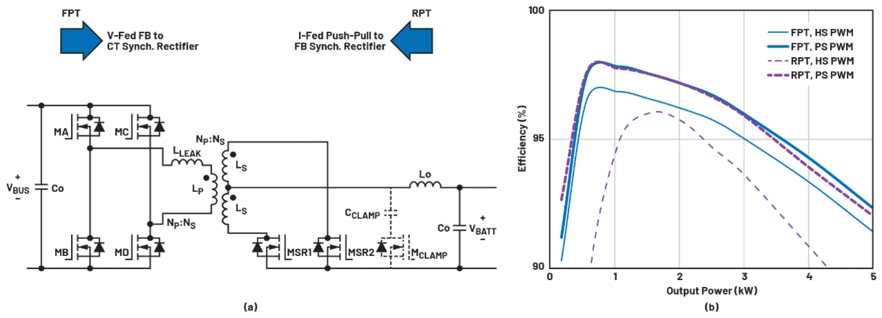 Die im vorigen Abschnitt untersuchten Funktionen zur Steigerung des Wirkungsgrads (PS-PWM mit adaptiven Totzeiten und aktiver Klemmung) wurden ebenfalls konfiguriert. Experimentell wurde festgestellt, dass es zur Erzielung einer korrekten ZVS bei den Aktiv-Passiv-Übergängen für RPT erforderlich war, die Totzeiten in der PWM-Sequenz zu ändern. Das heißt, das Einschalten der Sekundärschalter wurde so abgewandelt, dass sie vor jedem Übergang von aktiven zu passiven Intervallen erfolgen, um eine Stromumkehr zu ermöglichen.9