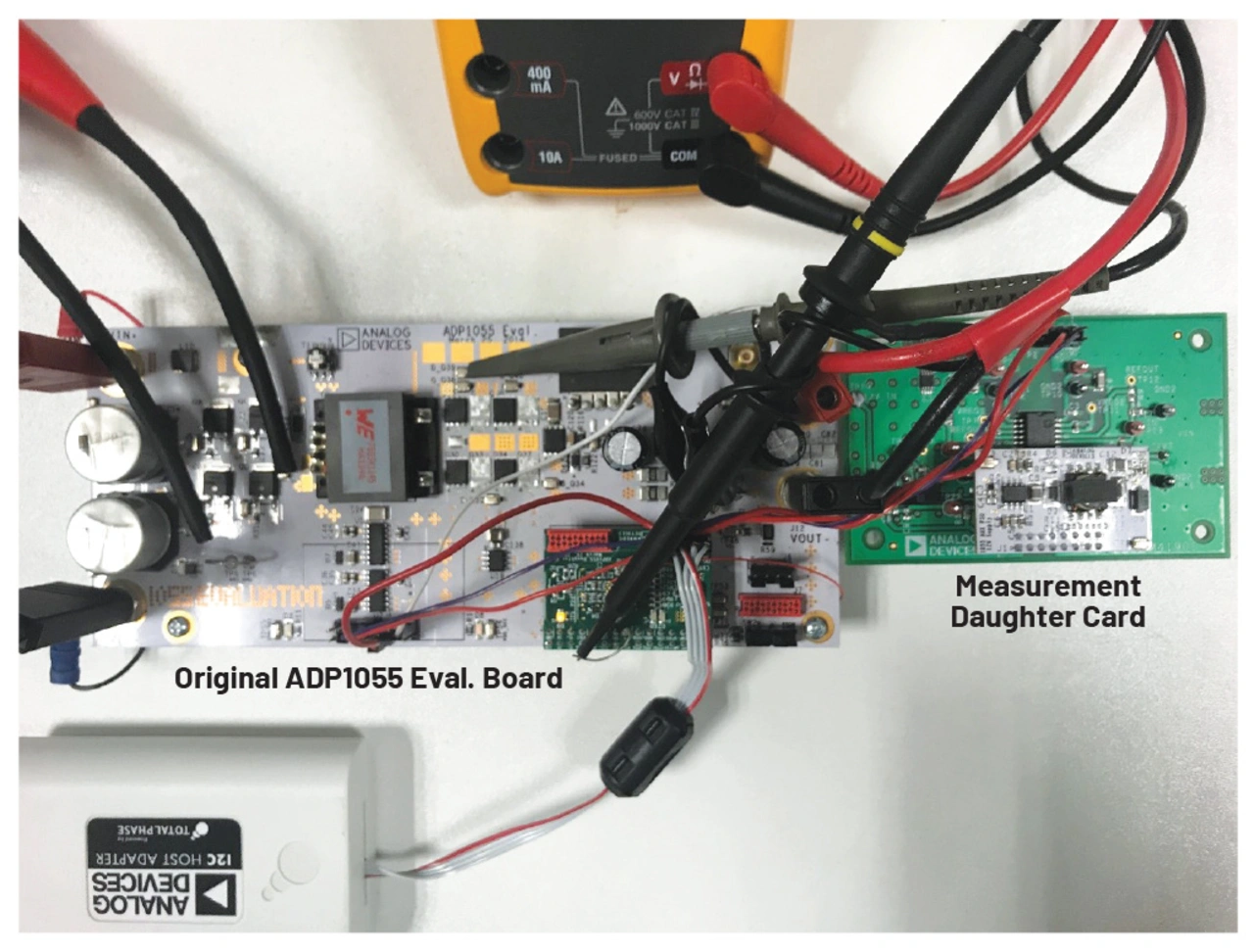 Das auf dem ADuM4195 basierende Messverfahren ist eine der wichtigsten Ergänzungen zur Hardware des Regelkreises. Neben einer sicheren Isolationsspannung von 5 kV (von der Hochspannungs-Primärseite zur Niederspannung-Steuerseite), einem breiten Eingangsbereich von bis zu 4,3 V und einer Genauigkeit von etwa 0,5% bei der Referenzspannung bietet der ADuM4195 eine hohe Mindestbandbreite von 200 kHz. Dies ermöglicht eine schnelle Schleifenregelung und damit eine bessere Reaktion auf Transienten als bei typischen Lösungen mit Strommess-Widerstand und Optokoppler, was für den Betrieb der Anwendung mit ihrer 125-kHz-Schaltfrequenz unerlässlich ist. Abbildung 7 zeigt den endgültigen Versuchsaufbau mit den Hardwareergänzungen aus Abbildung 6, die in einer ADuM4195-basierten Messkarte implementiert wurden, die dem ursprünglichen Evaluierungsboard im ADP1055-EVALZ-Nutzerhandbuch hinzugefügt wurde.
