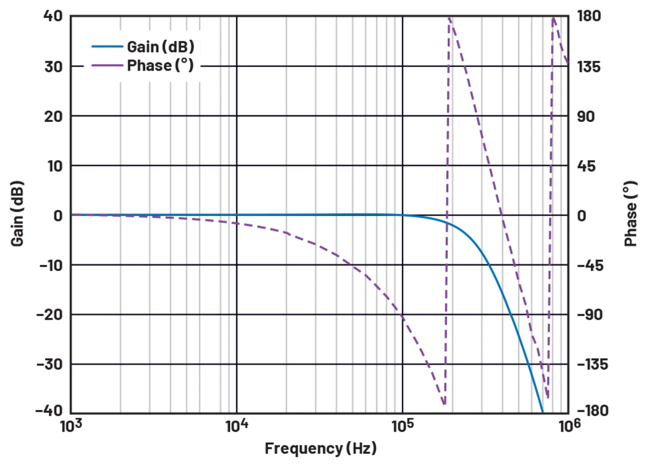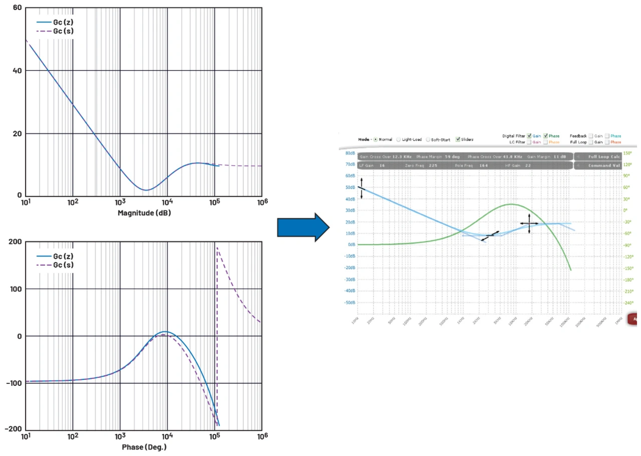 Eine der wichtigsten Beobachtungen dabei ist, dass die Reaktion in RPT instabil wäre, wenn die gleichen Regelkonstanten wie für FPT verwendet würden. Daher ist ein angemessener Entwurf der endgültigen Werte der Konstanten in Gc(s) für einen zuverlässigen Betrieb essenziell. Nachdem durch den Entwurf eine stabile Open-Loop-Übertragungsfunktion erreicht wurde, wurde der Regler zurück in den digitalen Bereich transformiert. Abbildung 9 (links) zeigt den Frequenzgang des entworfenen digitalen Filters Gc(z), der mit der grafischen Benutzeroberfläche des ADP1055 leicht konfiguriert werden kann, siehe Abbildung 9 (rechts).