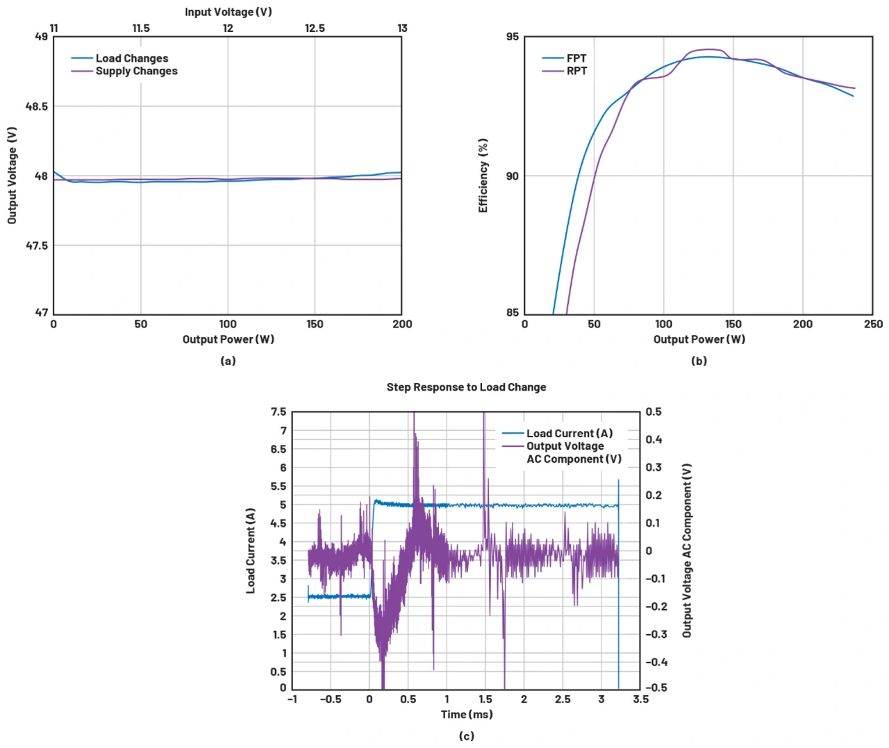 Die Anpassung an RPT wurde erfolgreich getestet, wobei 48 V in der Primärseite aus einem Eingang von 12 V in der Sekundärseite gewonnen wurden. Wie in Abbildung 10a dargestellt, wurde eine hervorragende Ausgangsspannungsregelung bei Last- und Eingangsspannungsänderungen von 0,1% bzw. 0,02% relativer Standardabweichung (Relative Standard Deviation, RSTDEV) erreicht (Abbildung 10a). Abbildungen 10b und 10c zeigen den Umwandlungswirkungsgrad bzw. die Sprungantwort auf eine 50%ige Laständerung. Die Wirkungsgrade im RPT-Modus sind ähnlich wie im FPT-Modus, wobei in beiden Fällen der Spitzenwert bei 94% im mittleren Leistungsbereich liegt. Die Parameter für die Sprungantwort (Überschwingen und Einschwingzeit) betragen 1% und 1,5 ms im RPT-Modus im Vergleich zu 2% und 800 μs im FPT-Modus. Es wird ein geringeres Überschwingen und eine etwas langsamere Einschwingzeit beobachtet, was zu einer stabilen Reaktion auf Transienten führt. Diese Ergebnisse bestätigen die Gültigkeit und den Erfolg des Entwurfsprozesses für die Anpassung des digitalen Reglers an die bidirektionale Leistungsübertragung.
