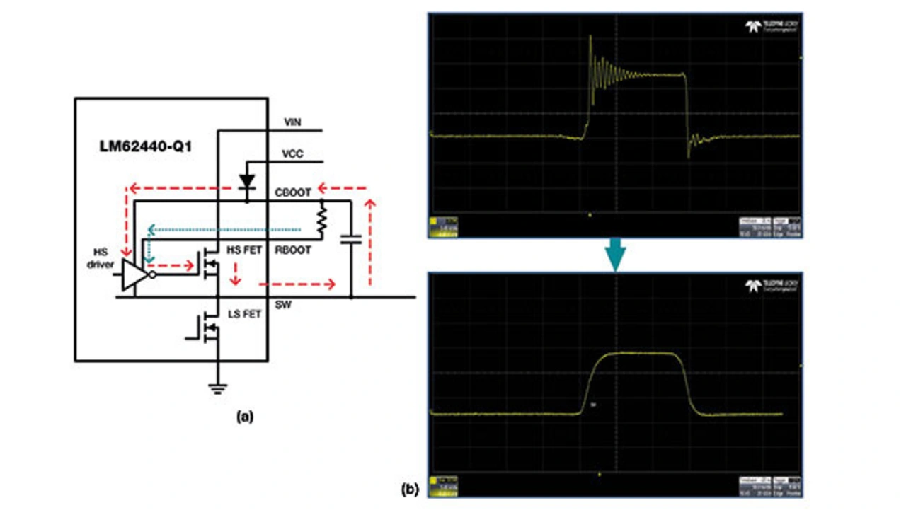 Bei Wandlern wie dem LM61440-Q1 oder dem LM62440-Q1 lässt sich mithilfe eines Widerstands festlegen, wie stark das Treibersignal des high-seitigen MOSFETs beim Einschalten ist (Bild 7). Der über den RBOOT-Pin fließende Strom (gepunkteter blauer Pfeil in der Blockschaltung Bild 7) wird multipliziert und aus CBOOT gezogen (gestrichelte rote Linie), um den high-seitigen Leistungs-MOSFET einzuschalten. Auf diese Weise kann der Widerstand die Anstiegsgeschwindigkeit kontrollieren, ohne dass der Wirkungsgrad sinkt, was unweigerlich passieren würde, wenn der Großteil des Stroms über den Serienwiderstand fließt.