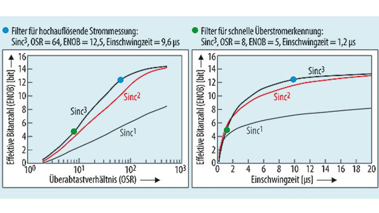 Vorteilhaft an digitalen Filtern ist, dass das Verhältnis zwischen Auflösung, Bandbreite und Einschwingzeit per Software konfiguriert werden kann und dass es möglich ist, zwei oder drei Filter auf denselben Bitstrom anzuwenden. Das Ergebnis ist eine genaue Phasenstrommessung für eine präzise Regelung – z.B. 12 ENOB mit einem Sinc3-Filter und 64-facher Überabtastung – und einer sehr schnellen Überstrom-Erkennung, z.B. 1,2 µs mit einem Sinc3-Filter und 8-facher Überabtastung.