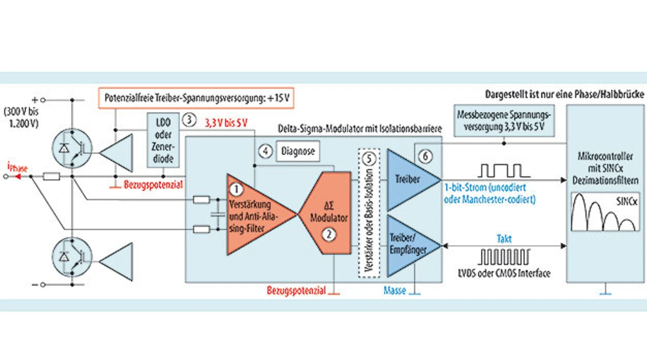 Bild 4 zeigt die Phasenstrommessung mit einem Strommesswiderstand und einem Delta-Sigma-Modulator mit galvanischer Trennung der Eingangsstufen von den Ausgangsstufen. Das Verfahren kann für drei Phasen oder für zwei Phasen angewendet werden, wobei im letzteren Fall die Stromstärke für die dritte Phase berechnet wird.