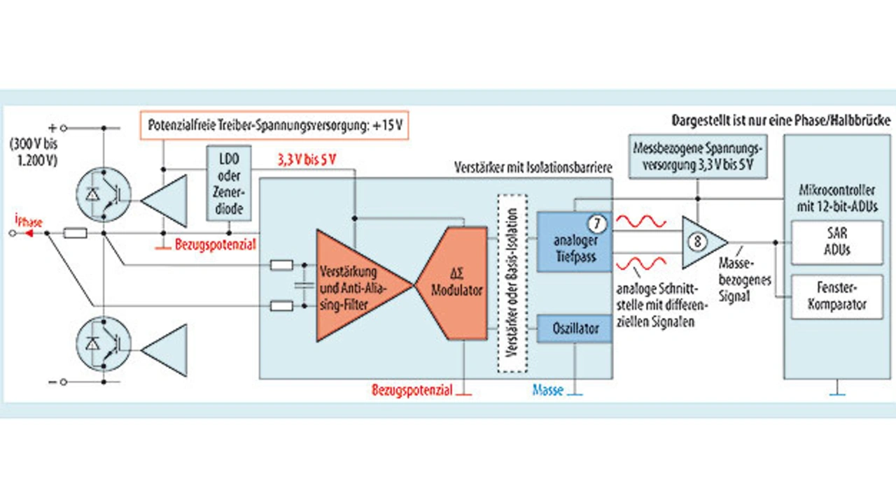 Die auf einem Verstärker mit integrierter Isolationsbarriere basierende Phasenstrommessung besteht aus drei Stufen, einem Verstärker zur galvanischen Trennung, einem zusätzlichen Verstärker zur Umsetzung des differenziellen in ein massebezogenes Signal sowie in der Regel einem massebezogenen SAR-ADU mit 12 bit. Für die Kurzschlusserkennung ist ein zusätzlicher Fensterkomparator für jede Phase erforderlich.