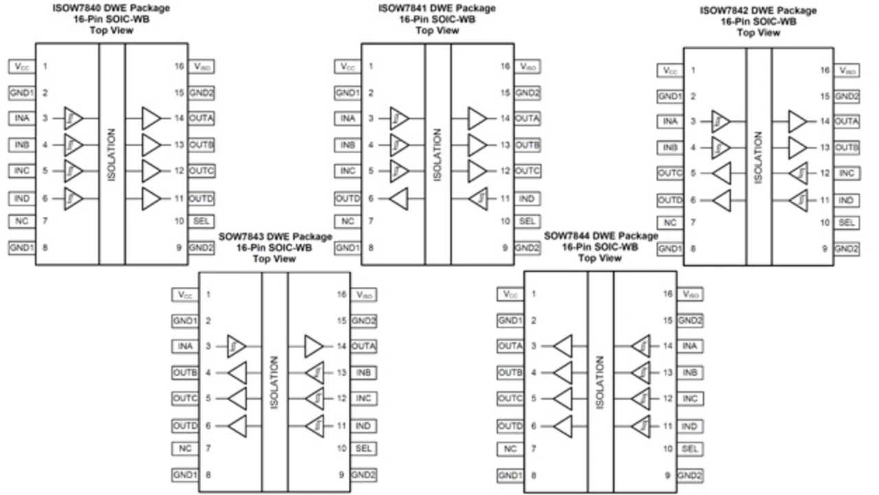 Texas Instruments bietet die Kombination digitaler Koppler plus DC/DC-Wandler mit vier Kanälen an. Die fünf Versionen innerhalb der ISOW784x-Reihe unterscheiden sich in der Übertragungsrichtung der vier Koppler – darunter auch zwei Versionen, die sich für SPI eignen, mit drei Kanälen in eine Richtung und einem Kanal in Gegenrichtung.