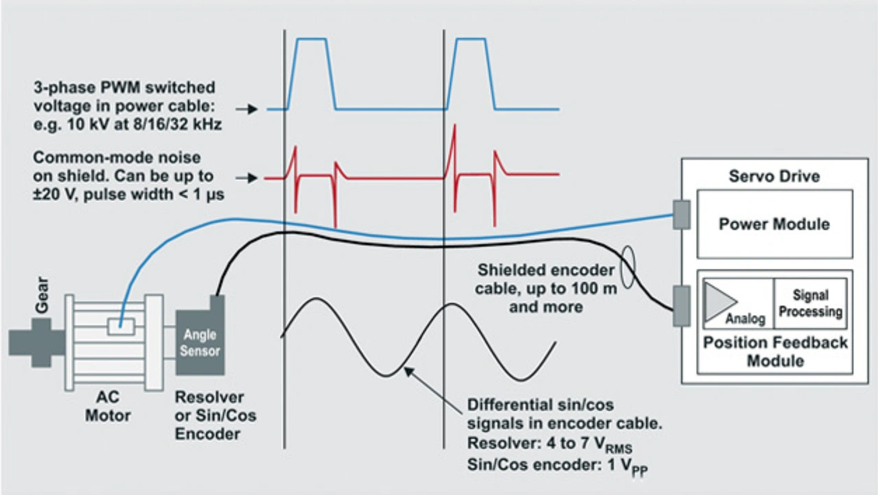 Ein wichtiger Aspekt, der beim Design eines präzisen Signalpfads leicht übersehen wird, ist die Unempfindlichkeit gegenüber hochfrequenten Störgrößen. Hochfrequente Gleichtaktstörungen werden üblicherweise von den Motorzuleitungen, auf denen geschaltete PWM-Signale übertragen werden, in die Resolver-Kabel oder direkt in das Motorgehäuse gekoppelt (Bild 4). Beim Verbinden der Zuleitungen mit dem Motor (beispielsweise im Innern eines Roboters) ist das Motorkabel möglicherweise auf einer Länge von bis zu 20 cm nicht abgeschirmt. Die Gleichtaktstörgrößen sind deshalb meist AC mit Impulsen mit einer Breite von ca. 1 µs und einer Amplitude von ±20 V. In diesem Fall kommt es also auf die Gleichtaktunterdrückung bei höheren Frequenzen von ca. 400 kHz bis 1 MHz an.
