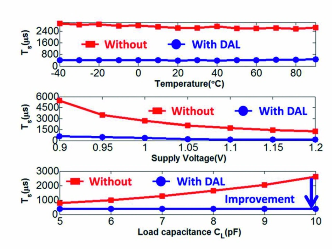 Diese Arbeit erreicht unter den bisherigen Arbeiten das höchste Reduktionsverhältnis bezüglich Einschwingzeit (13,3×) und Anlaufenergie (6,9×). Darüber hinaus ist der Mehraufwand der DAL-Schaltkreise bezüglich Chipfläche (0,0073 mm²) und Energie (3,3 nJ) vernachlässigbar, da kein zusätzlicher Injektionsoszillator nötig ist. Noch wichtiger aber ist, dass die Schaltkreise alle vollständig autonom mit nur einem Enable-Signal arbeiten, wodurch ein zusätzlicher kalibrierter höherfrequenter Oszillator oder eine im Vorfeld laufende Kontrollsequenz unnötig sind, was die Komplexität des Systems signifikant reduziert.(rh)