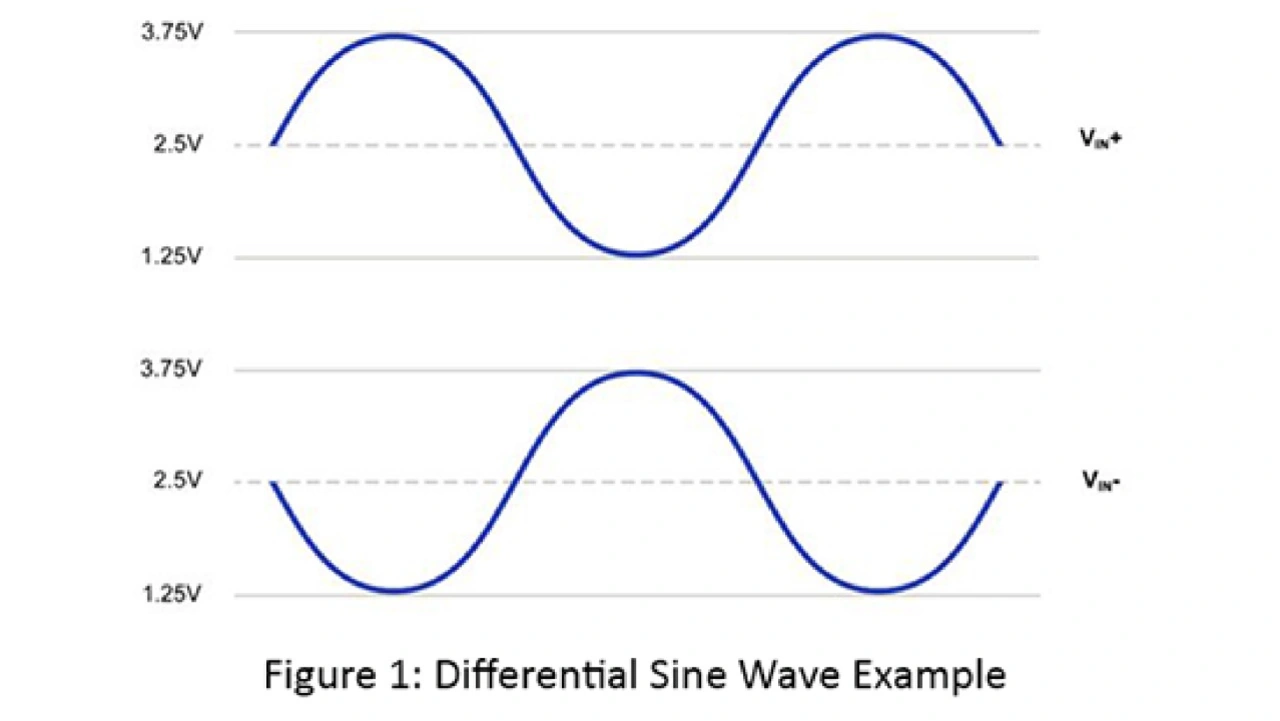 Im obigen Beispiel beträgt die volle Eingangsspannung differenziell 5 VSS (Spitze-Spitze), wobei jeder Schenkel 2,5 VSS schwingt. Der Gleichtaktpegel beträgt in diesem Beispiel 2,5 V. Ein Großteil der heutigen Hochleistungs-ADCs verfügt über eine differenzielle Eingangsarchitektur, da diese eine bessere Leistungsfähigkeit bietet (im Vergleich zu Single-Ended-Eingängen). Zu diesen Leistungsvorteilen gehören die Fähigkeit, Gleichtaktrauschen und gemeinsame Störsignale zu unterdrücken, sowie ein um 6 dB (Faktor 2) höherer Dynamikbereich.