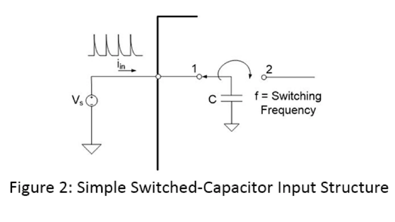 Ein ungepufferter Switched-Capacitor-Eingang, wie der oben beschriebene, kann erhebliche Probleme auf Systemebene verursachen. Der Strom, der erforderlich ist, um den Abtastkondensator auf die entsprechende Spannung zu laden, muss von der externen Schaltung geliefert werden, die mit dem ADC-Eingang verbunden ist. Wird der Kondensator auf den Abtastknoten geschaltet (Schalterposition 1 in Bild 2), ist eine große Strommenge erforderlich, um den Kondensator zu laden. Die Größe dieses momentanen Stroms ist eine Funktion der Größe des Abtastkondensators, der Frequenz, mit der der Kondensator geschaltet wird, und der am Abtastknoten anliegenden Spannung. Dieser Schaltstrom lässt sich durch folgende Gleichung beschreiben: