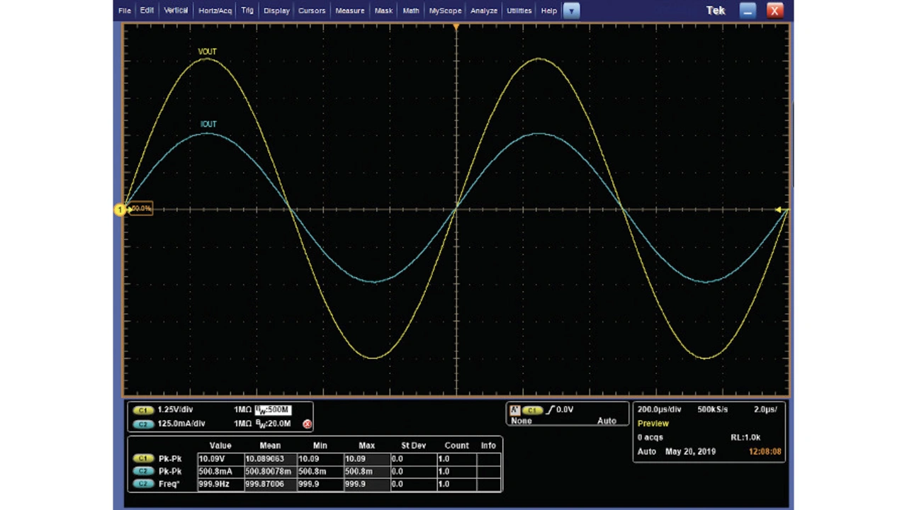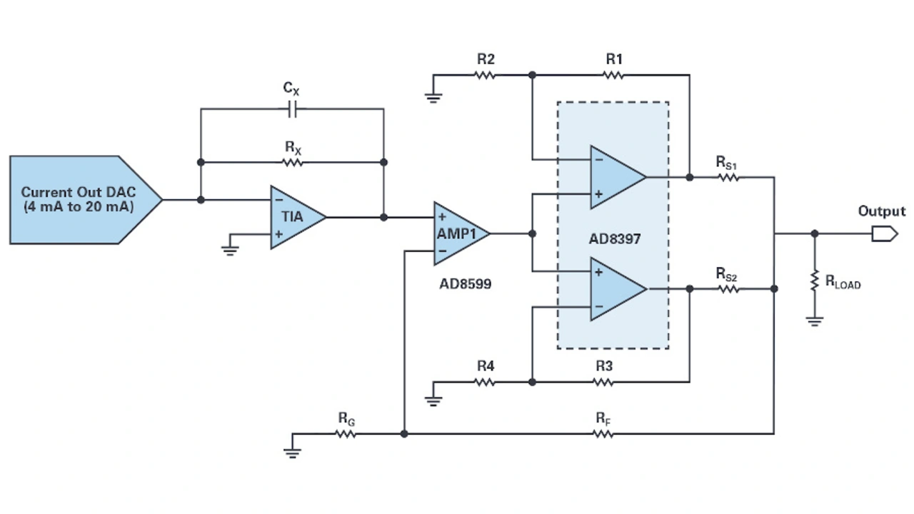In der Schaltung wird der Ausgang eines 4-20-mA-D/A-Umsetzers mit einem Transimpedanzverstärker (TIA) in eine Spannung umgesetzt, die dann zur weiteren Verstärkung an den Eingang des kombinierten Verstärkers angelegt wird. Mit dem AD8397 als Ausgangstreiber (OPV2) können die Anforderungen an diesen Schaltungsausgang erreicht werden. Der AD8397 ist ein Rail-to-Rail-High-Current-Verstärker, der auch den geforderten, hohen Ausgangsstrom liefern kann.