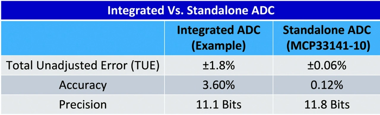 Nun ein genauerer Blick auf einen in eine MCU integrierten 12-bit-ADC mit 400 kSample/s. Im Datenblatt ist der gesamte unbereinigte Fehler (Total Unadjusted Error, TUE) mit ±1,8 Prozent von –40 bis +85 °C angegeben. Ein 6-bit-ADC mit einem Gesamtfehler von 1 LSB ergibt eine Genauigkeit von 1,6 Prozent. Was ist also mit den anderen 6 Bits des 12-bit-ADCs passiert? Darüber hinaus kann der Fehler auch noch positiv oder negativ sein, d. h. die Messwerte des ADC können um 3,6 Prozent oder 90 mV schwanken. In diesem Fall führt der große Verstärkungsfehler über die Temperatur zu einer stark reduzierten Genauigkeit. Dieser große Genauigkeitsfehler ist ein Nebenprodukt der prozessbedingten Einschränkungen. Bei der Lektüre von Datenblättern für integrierte ADCs sollte man sehr vorsichtig sein. In manchen Fällen gibt das Datenblatt für den integrierten ADC die ADC-Parameter unter Verwendung einer externen Spannungsreferenz an, da die integrierte Spannungsreferenz aufgrund ihres Rauschens, Drift und schlechter Leistung die Nutzung des internen ADC verbieten würde. Daher ist die Genauigkeit des integrierten ADC in diesem Fall nicht ausreichend für die Erfüllung der 0,8-Prozent-Anforderung.