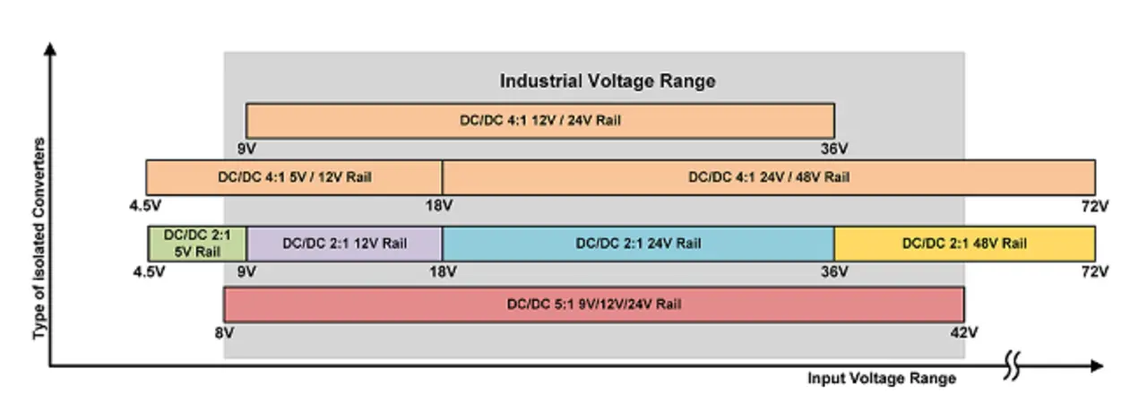 Typischerweise nutzt die Industrie Isolierte Wandler mit den Verhältnissen 2:1 und 4:1 zur Abdeckung des weiten Eingangsspannungsbereichs von 8 V bis 42 V (siehe Abbildung 1).