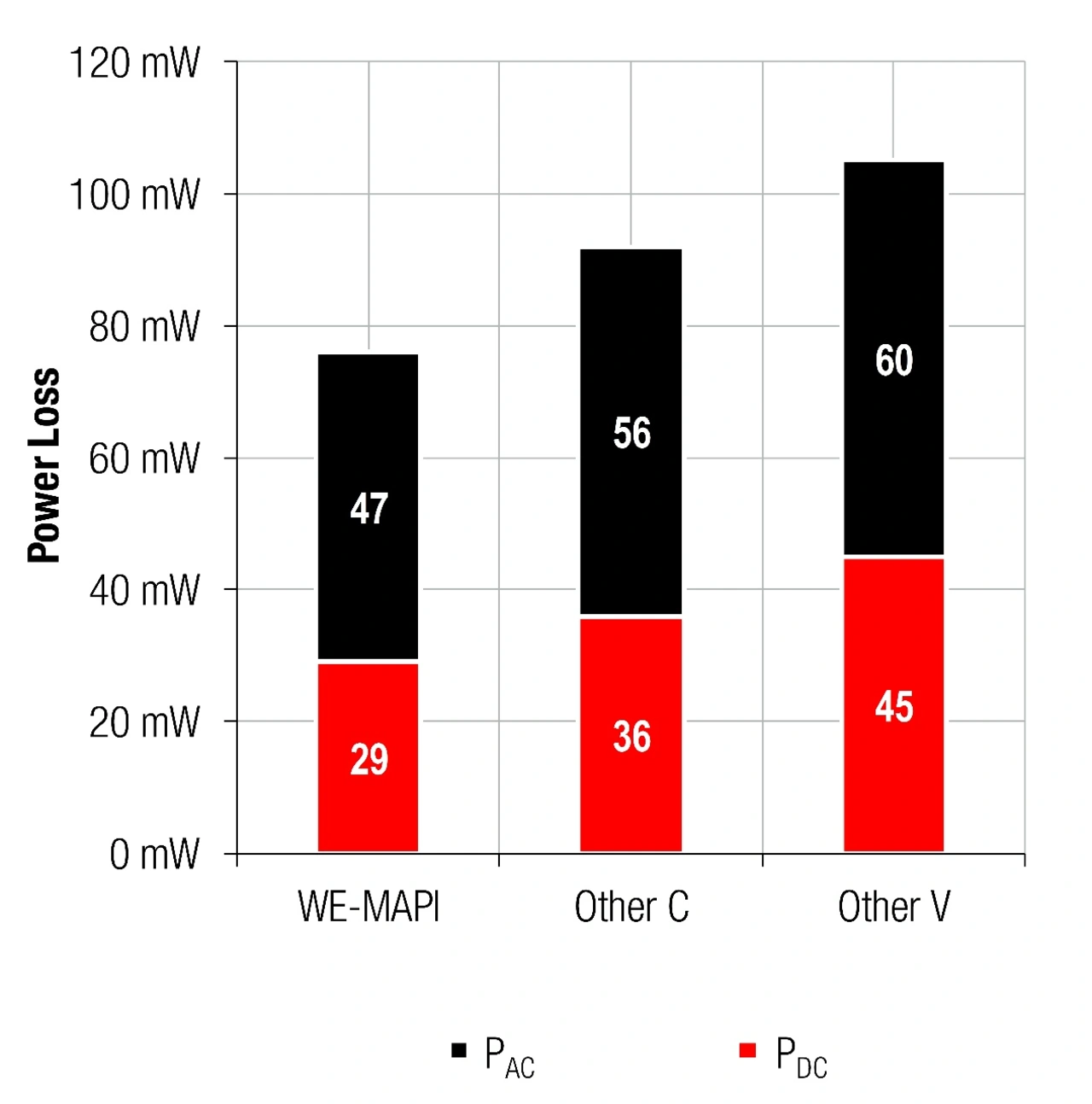 Welchen Stellenwert in modernen Schaltreglern die AC-Verluste haben, lässt sich mit einem simplen Aufbau und der Messung der entsprechenden Verluste ermitteln. Als Beispiel kommt ein Tiefsetzsteller mit einer Eingangsspannung von 24 V zum Einsatz. Am Ausgang steht eine Spannung von 12 V bei einem Strom von 2 A zur Verfügung. Die Taktfrequenz liegt bei 500 kHz. In dem Vergleich in Bild 4 wurde eine Speicherinduktivität mit 2,2 µH der Serie WE-MAPI 4020 vermessen, und mit bauformgleichen Speicherinduktivitäten verglichen. Es ist deutlich zu erkennen, dass bei allen vermessenen Spulen die AC-Verluste die DC-Verluste übertreffen.