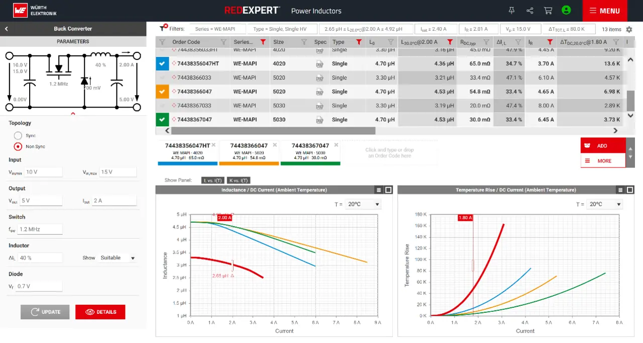 Die WE-MAPI-Speicherinduktivitäten sind mit ihrem innovativen Kernmaterial und dem durchdachten Design auf eine maximale Leistung auf kleinstem Raum ausgelegt. Für energieeffiziente Schaltregler wählt man die passende WE-MAPI-Speicherdrossel am besten mit REDEXPERT (Bild 6), der Online-Designplattform von Würth Elektronik aus. Hier ist das weltweit genaueste AC-Verlustmodell integriert, welches über weite Wertebereiche für die Parameter Frequenz, Rippelstrom und Tastverhältnis eine sehr hohe Genauigkeit erreicht.